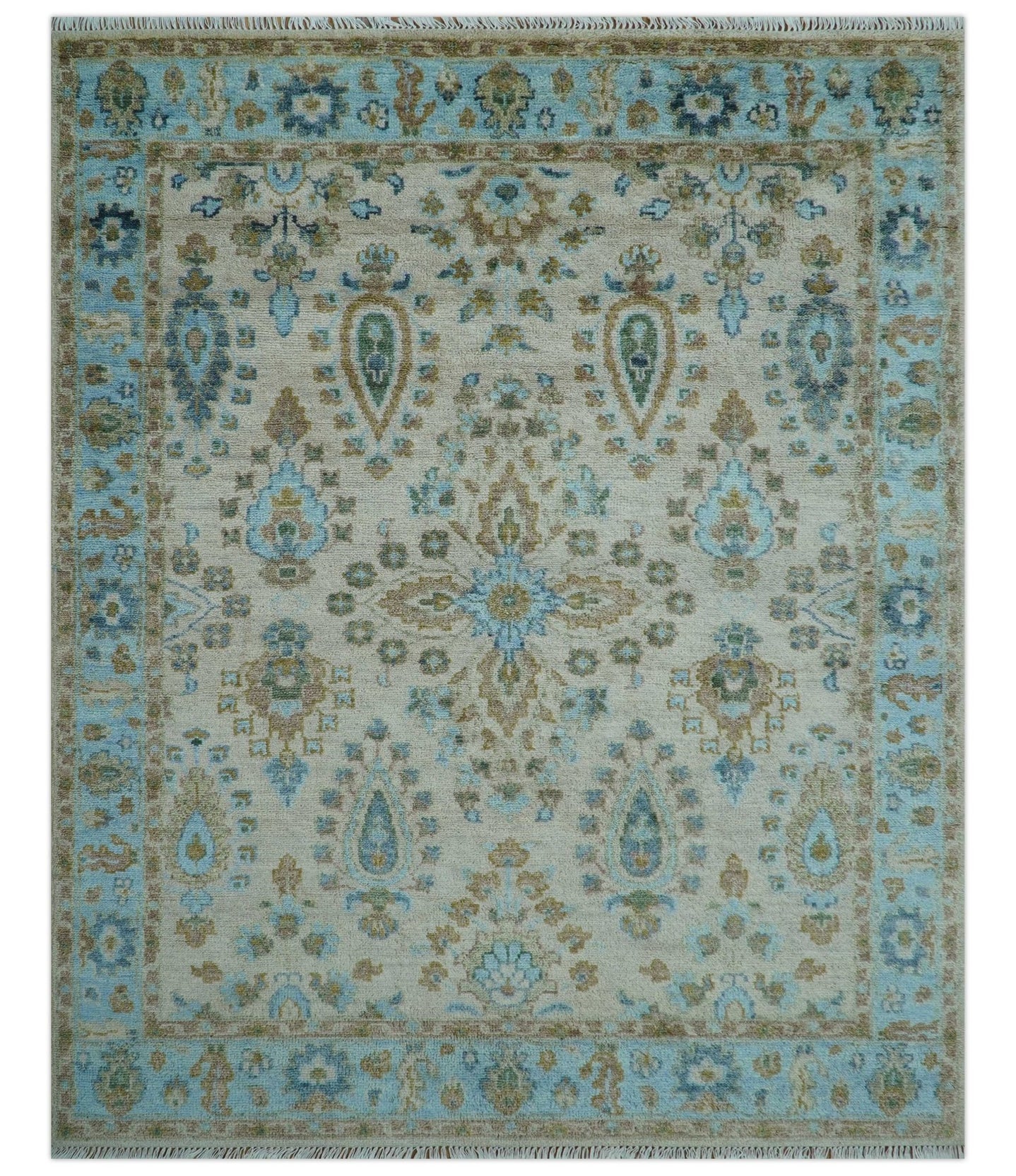 Custom Made Turkish Design Beige and Blue Hand Knotted Wool Rug