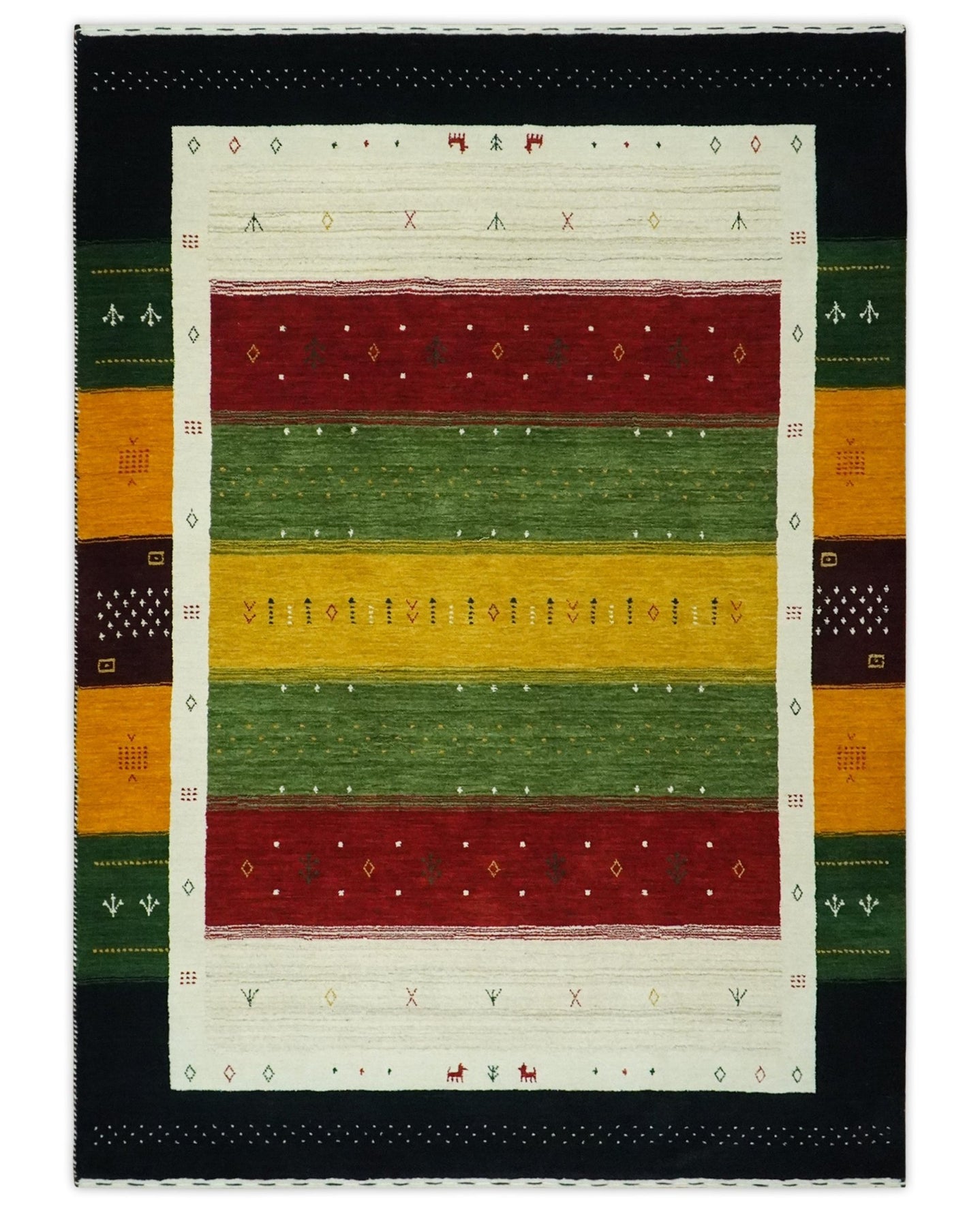 Geometrical Stripes Design Green Hand loom Multi Size wool Area Rug
