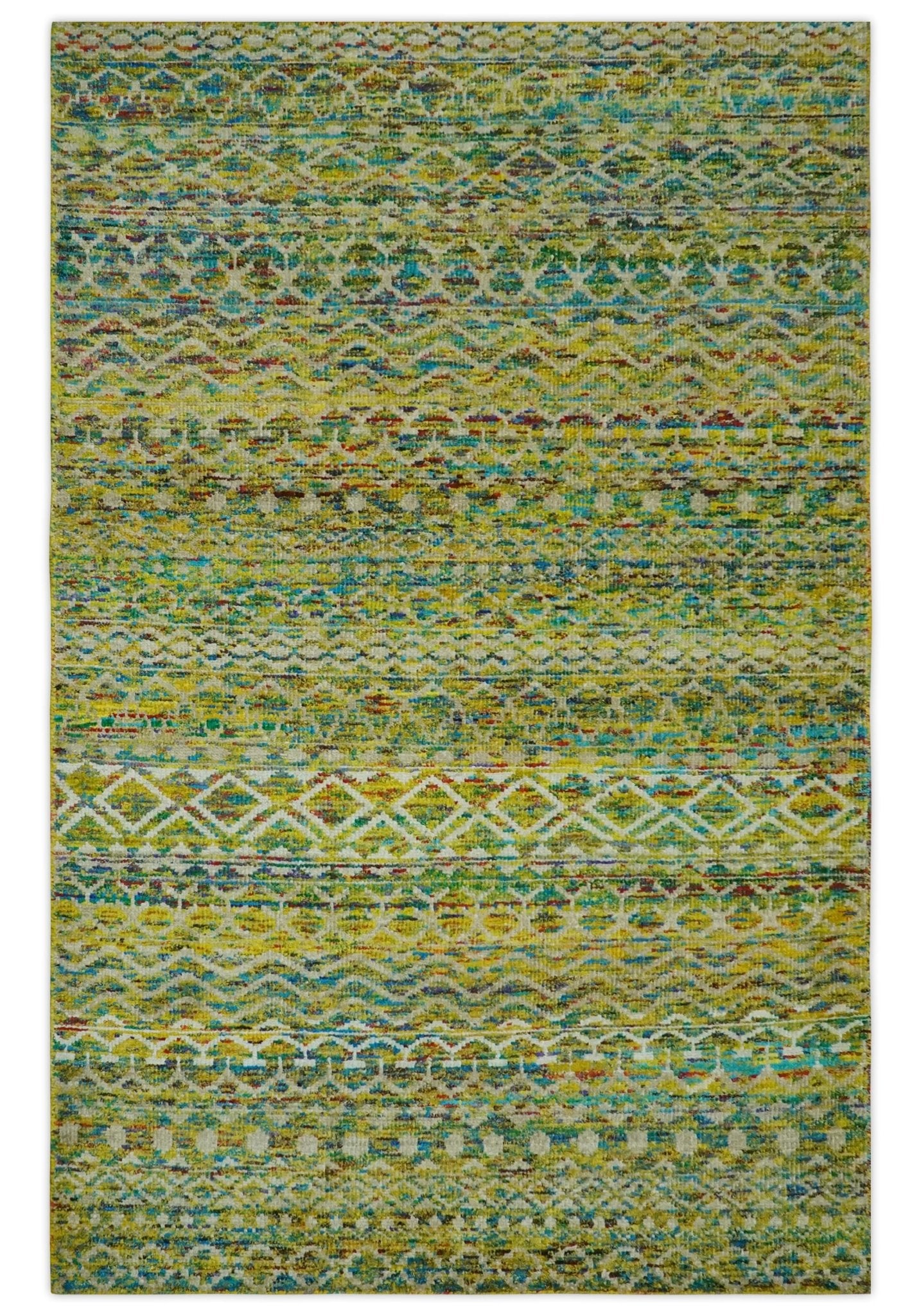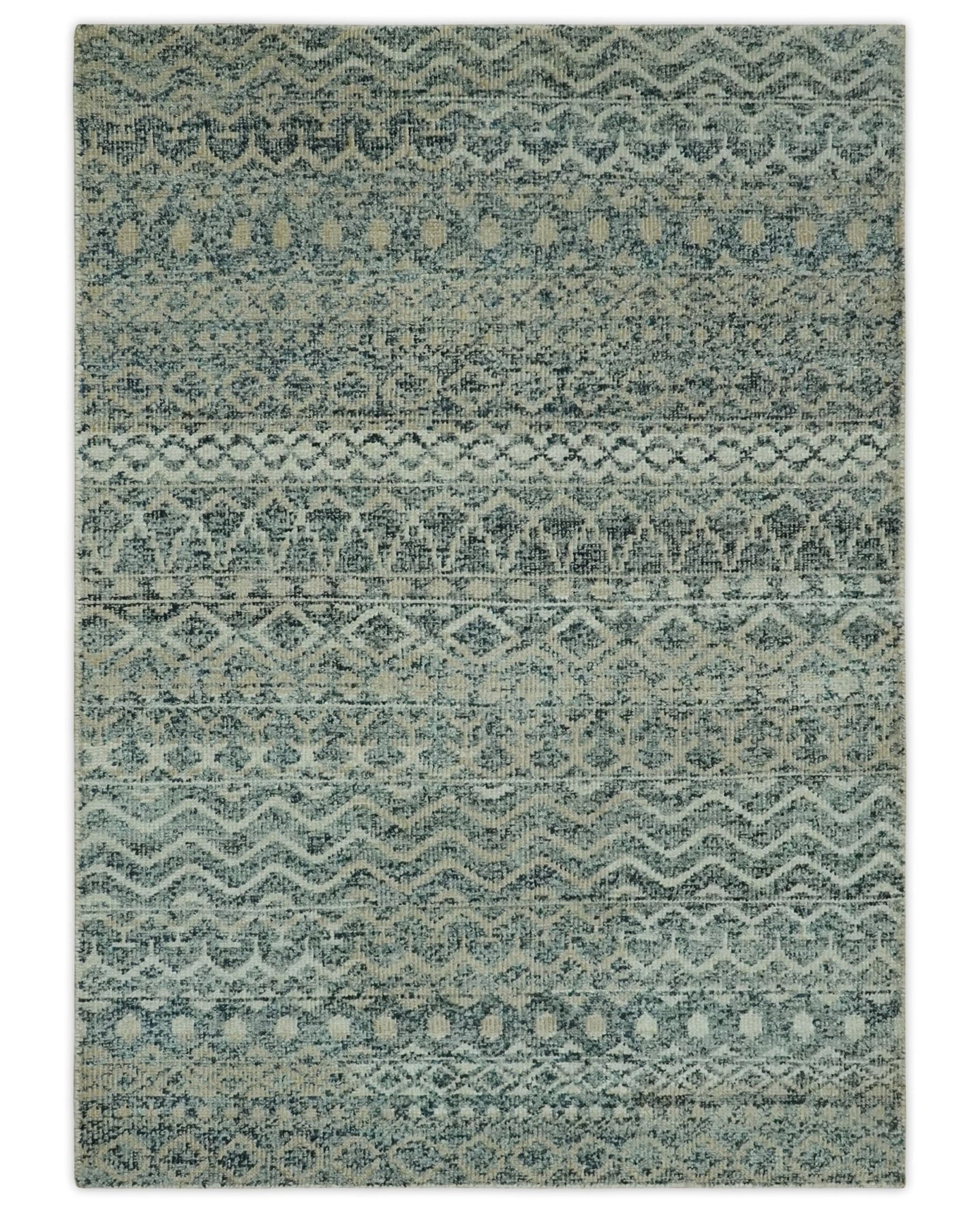 Geometrical Stripes Design Green Hand loom Multi Size wool Area Rug