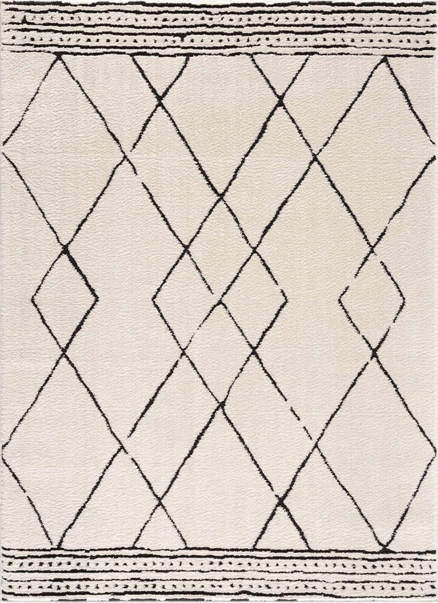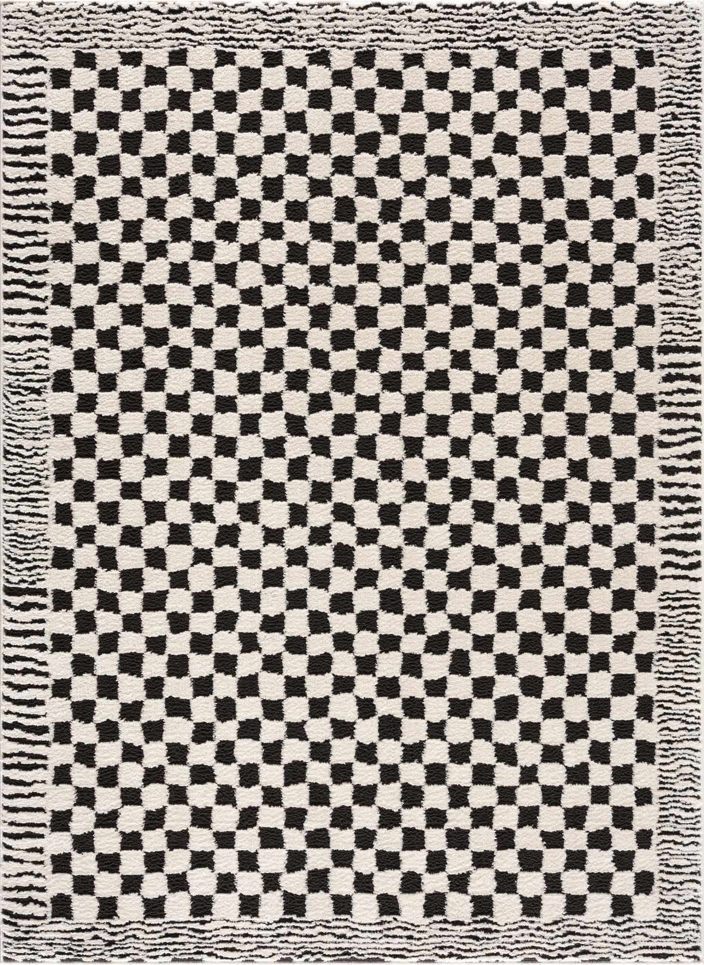 Modern Geometrical Ivory and Black Checkered Plush Pile Moroccan Style Area Rug