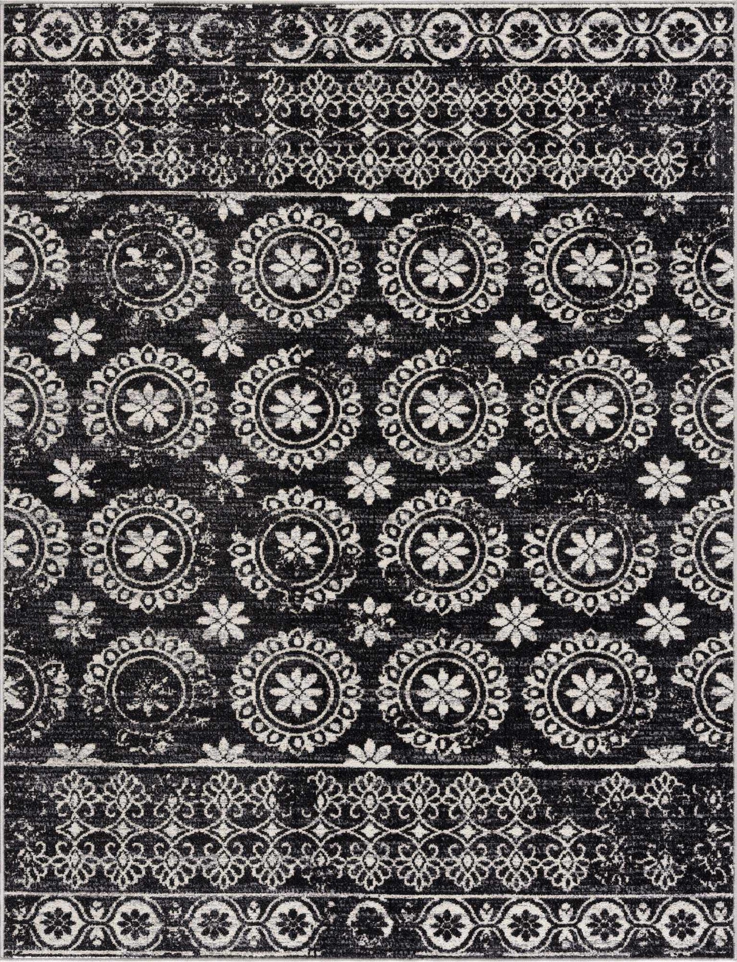 Traditional Charcoal and Ivory Low Pile Washable Area Rug