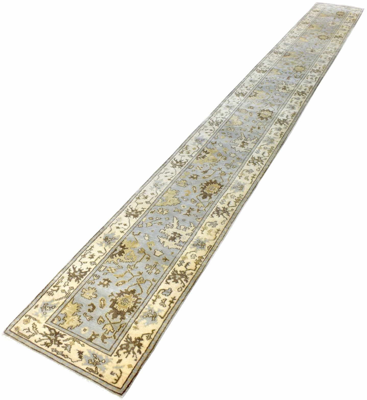 Hand Knotted Brown and Beige Antique Oushak Wool Runner Rug