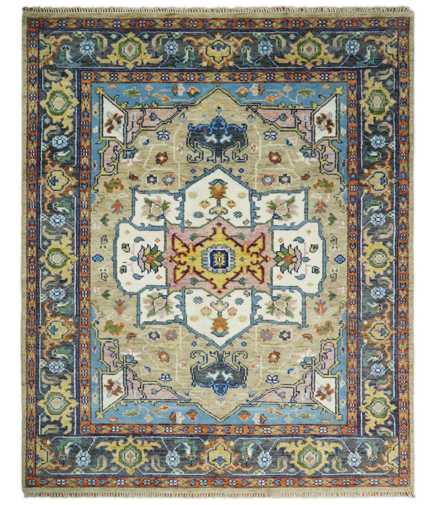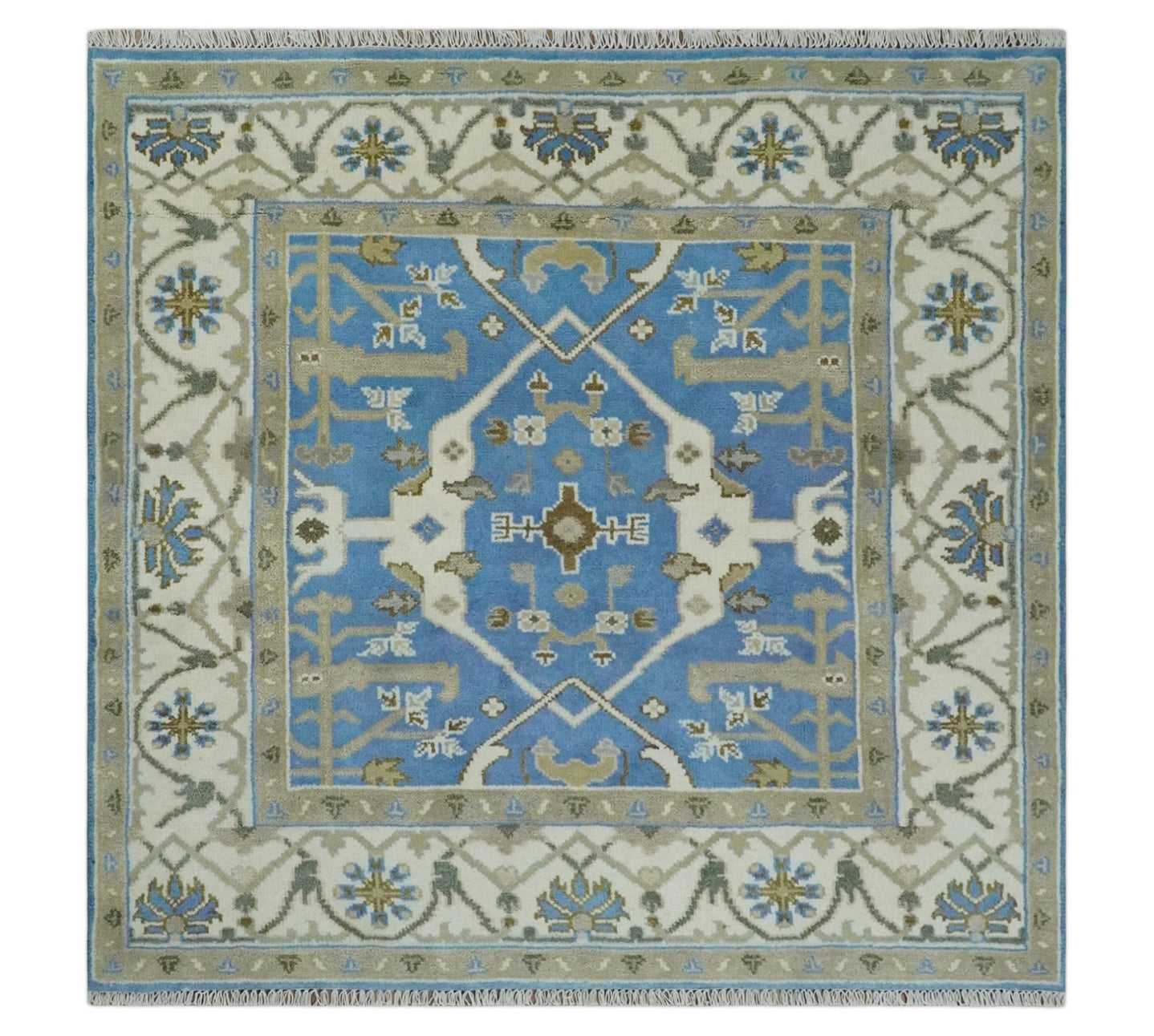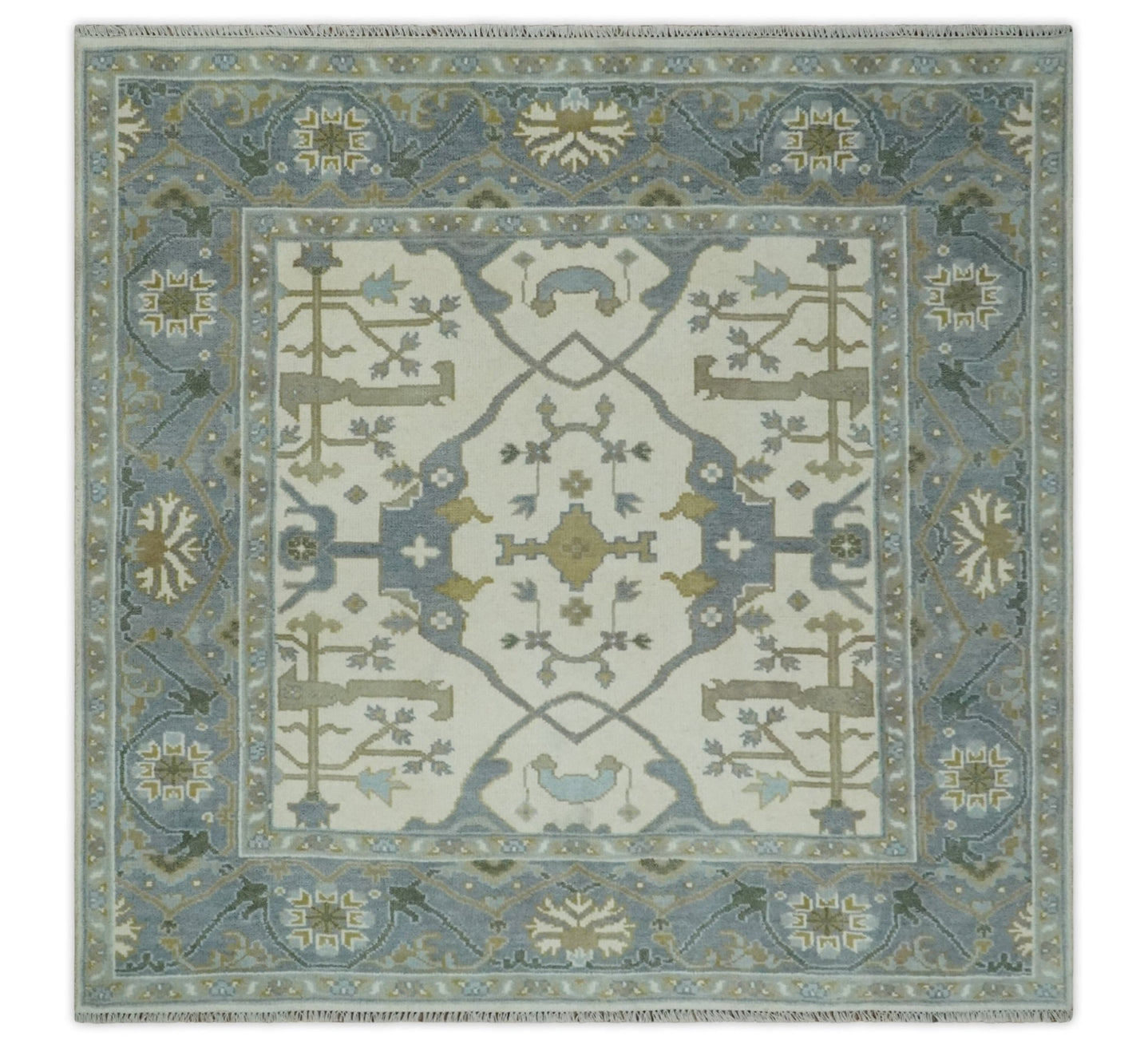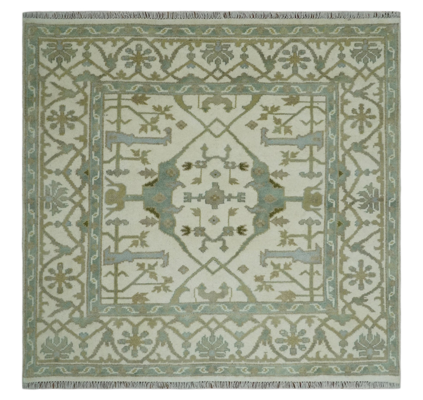 Hand Knotted Oriental Oushak Ivory and Teal Wool Area Rug