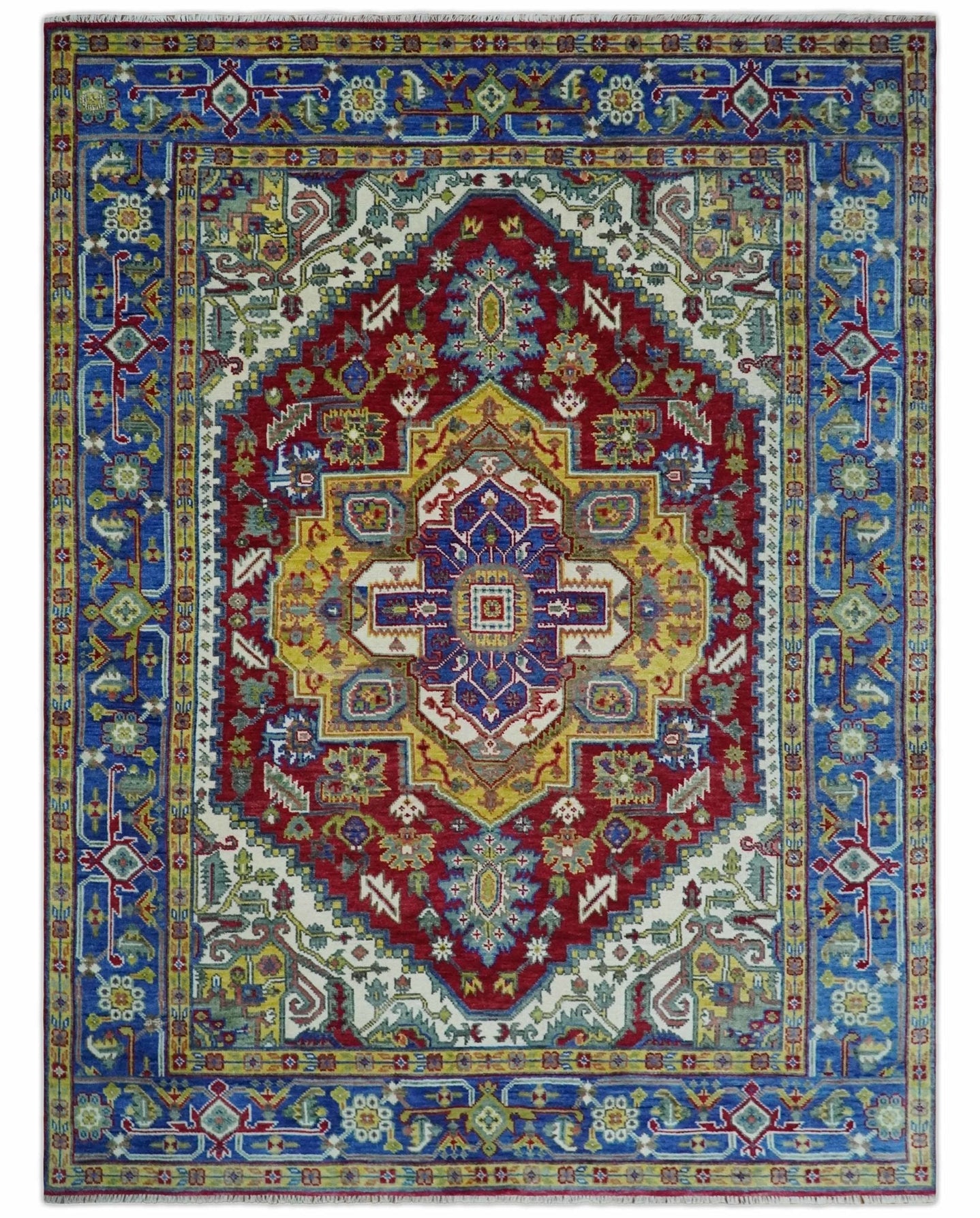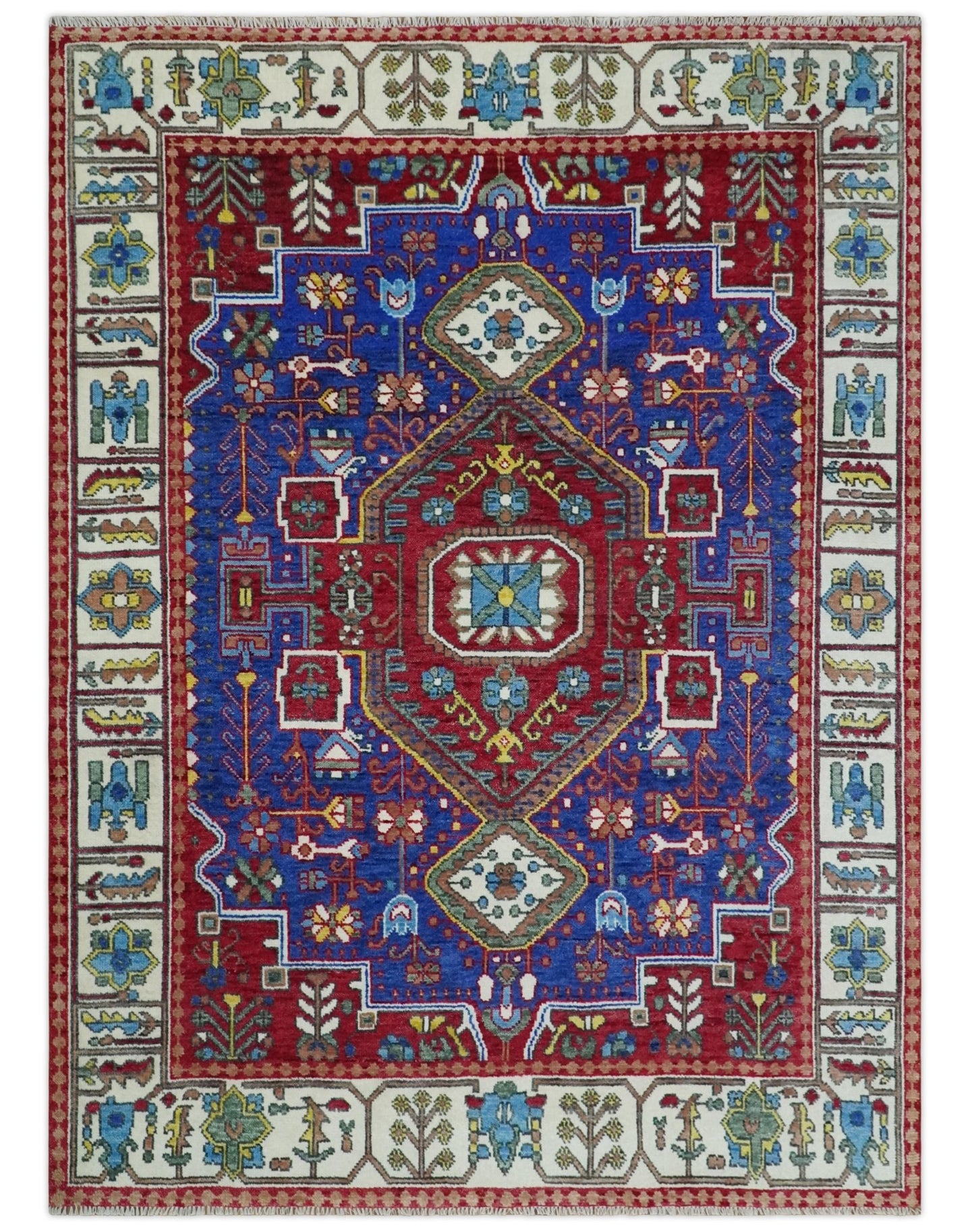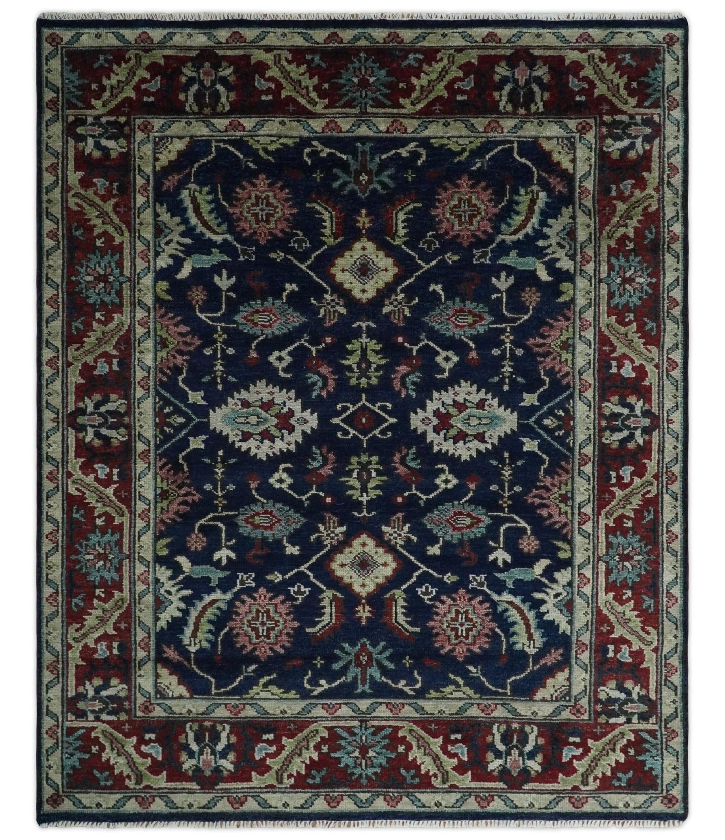 Custom Made Maroon, Blue and ivory Hand Knotted Traditional Wool Rug