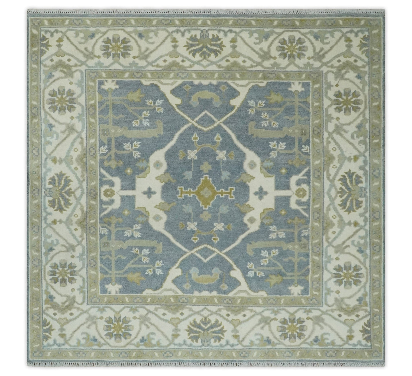 Custom Made Hand Knotted Oriental Oushak Blue and Ivory Wool Area Rug