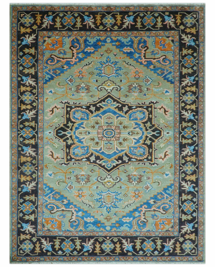 Custom Made Green And Blue Traditional Heriz Hand Knotted Wool Rug