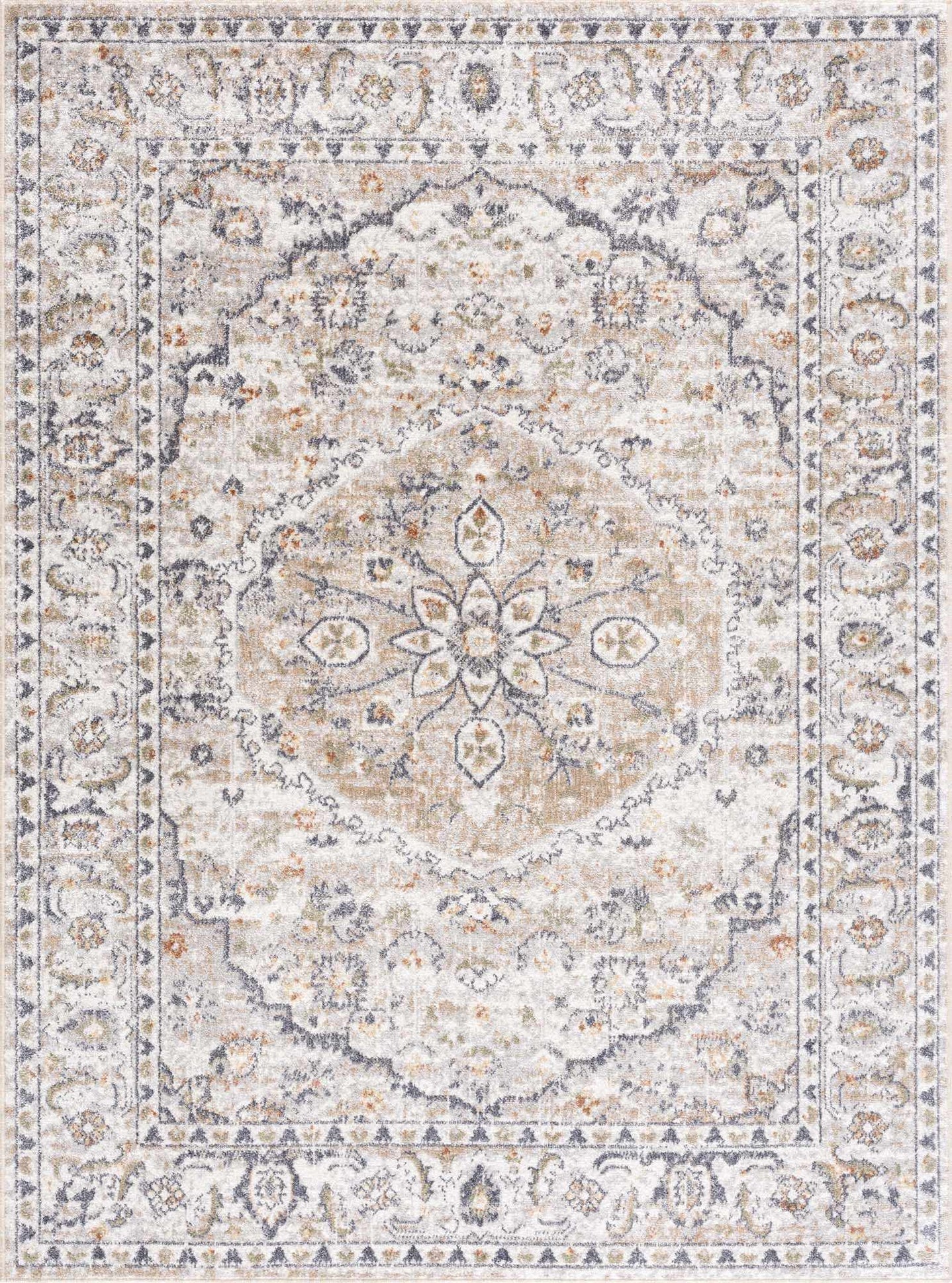 Silver, Charcoal and Beige Medallion Traditional Design Washable Area Rug