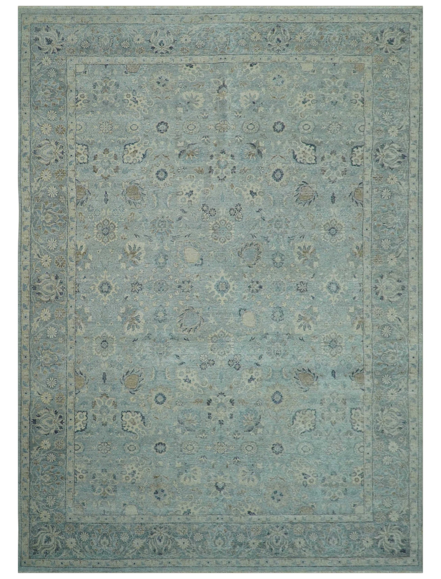 Transitional Design Green And Blue Hand Knotted Custom Made Wool Rug