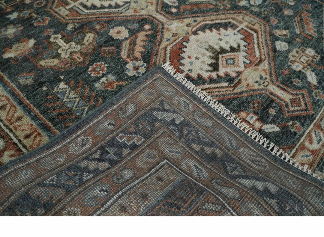 This finely crafted hand-knotted Heriz wool area rug features a classic antique finish in a unique combination of charcoal, beige and rust colors. Each custom-made rug is of superior quality and is beautifully designed to provide a timeless look.