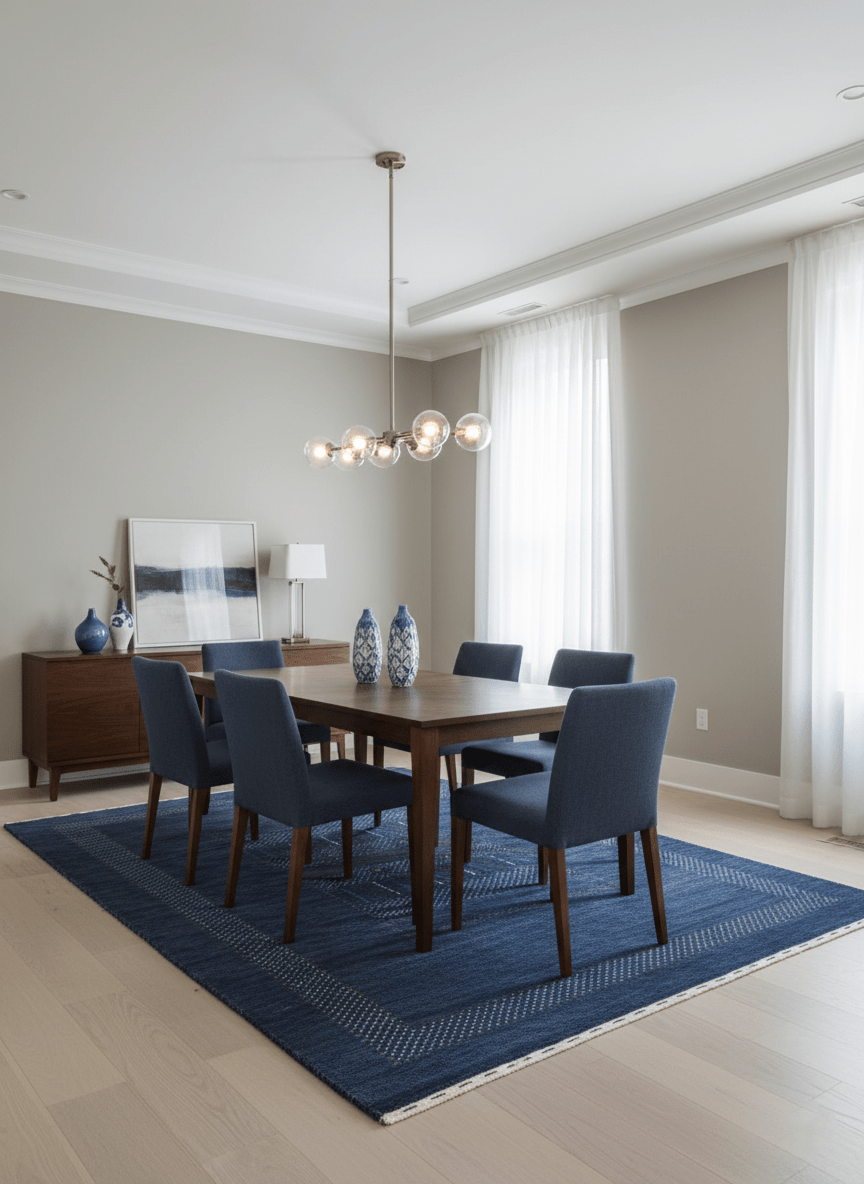 This hand-loomed wool area rug showcases an elegant blue and white center pattern, meticulously crafted using traditional weaving methods. The sophisticated design complements diverse interiors while the premium wool construction ensures lasting quality and natural durability for years of refined enjoyment.