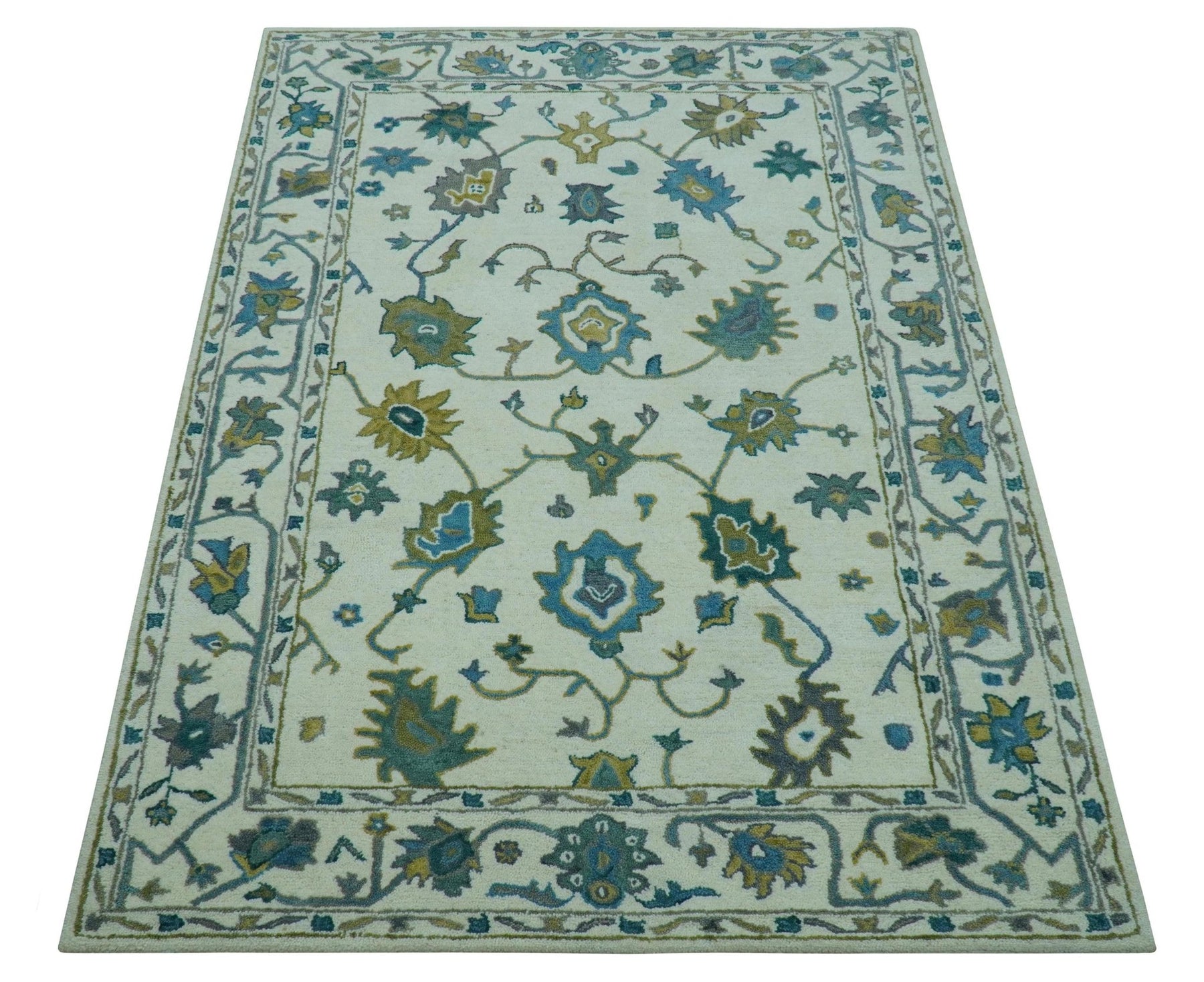 Custom Made Traditional Ivory And Blue Oushak Hand Tufted Wool Area Rug