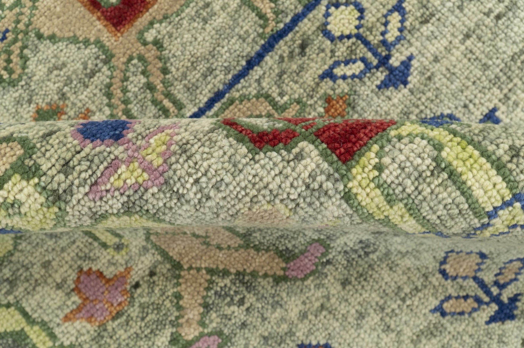 Expertly crafted from 100% wool, this custom-made area rug features a beautifully hand-knotted design in shades of green beige, rust, and blue, showcasing traditional folk art elements. Experience the luxurious softness and durability of wool while adding a unique touch to your decor.