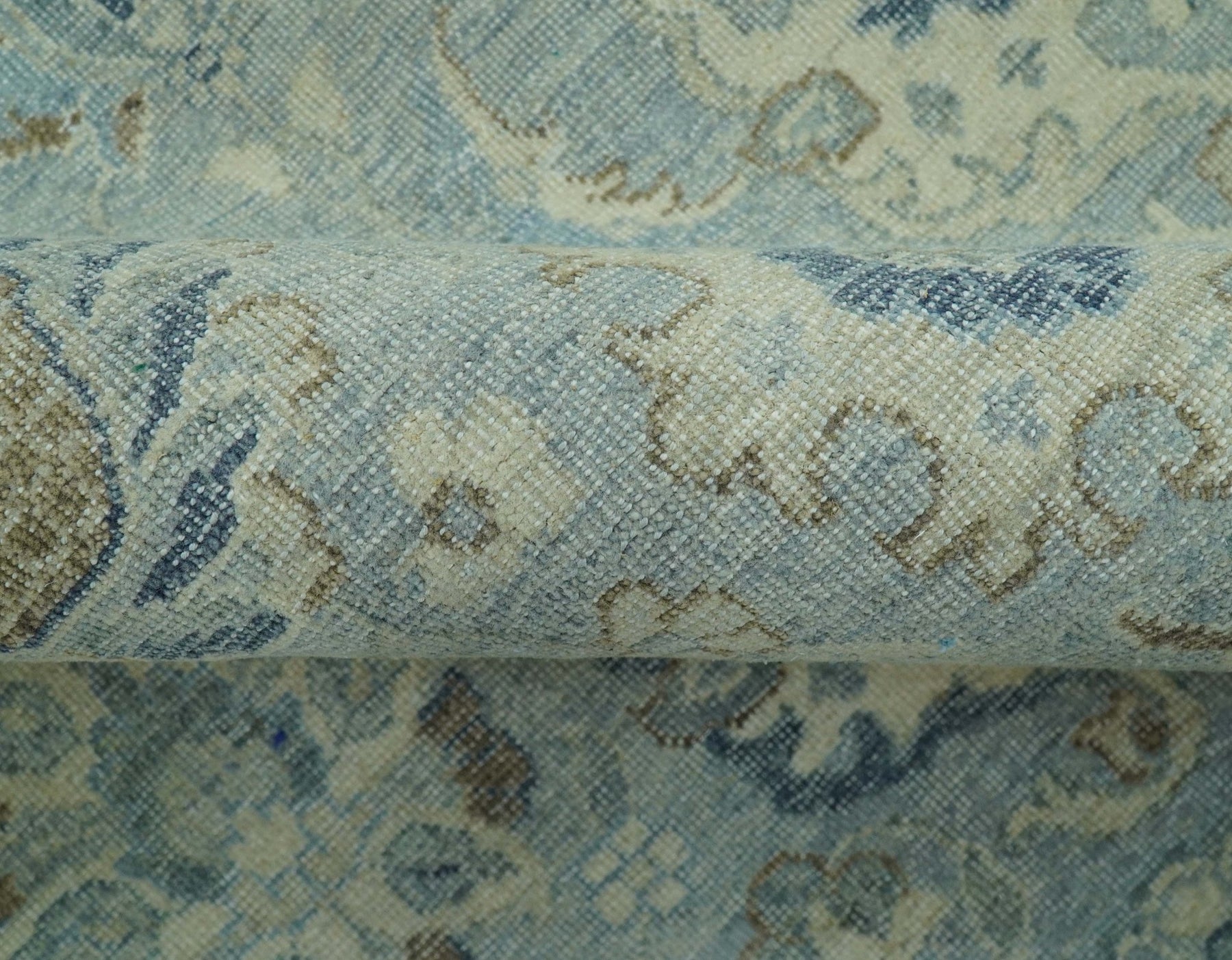 Distressed Hand Knotted Blue And Beige Traditional Design 9x13 Wool Area Rug