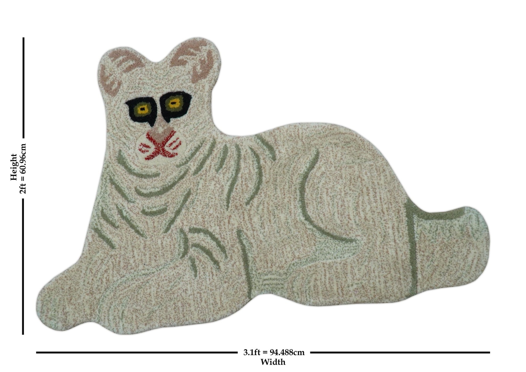 This hand-tufted wool rug showcases an exquisite tiger motif rendered in sophisticated beige hues. Measuring 2x3 feet, it's ideal for accent spaces requiring refined animal-inspired décor. The wool construction ensures lasting resilience and tactile quality, making it both a functional and artistic floor covering.
