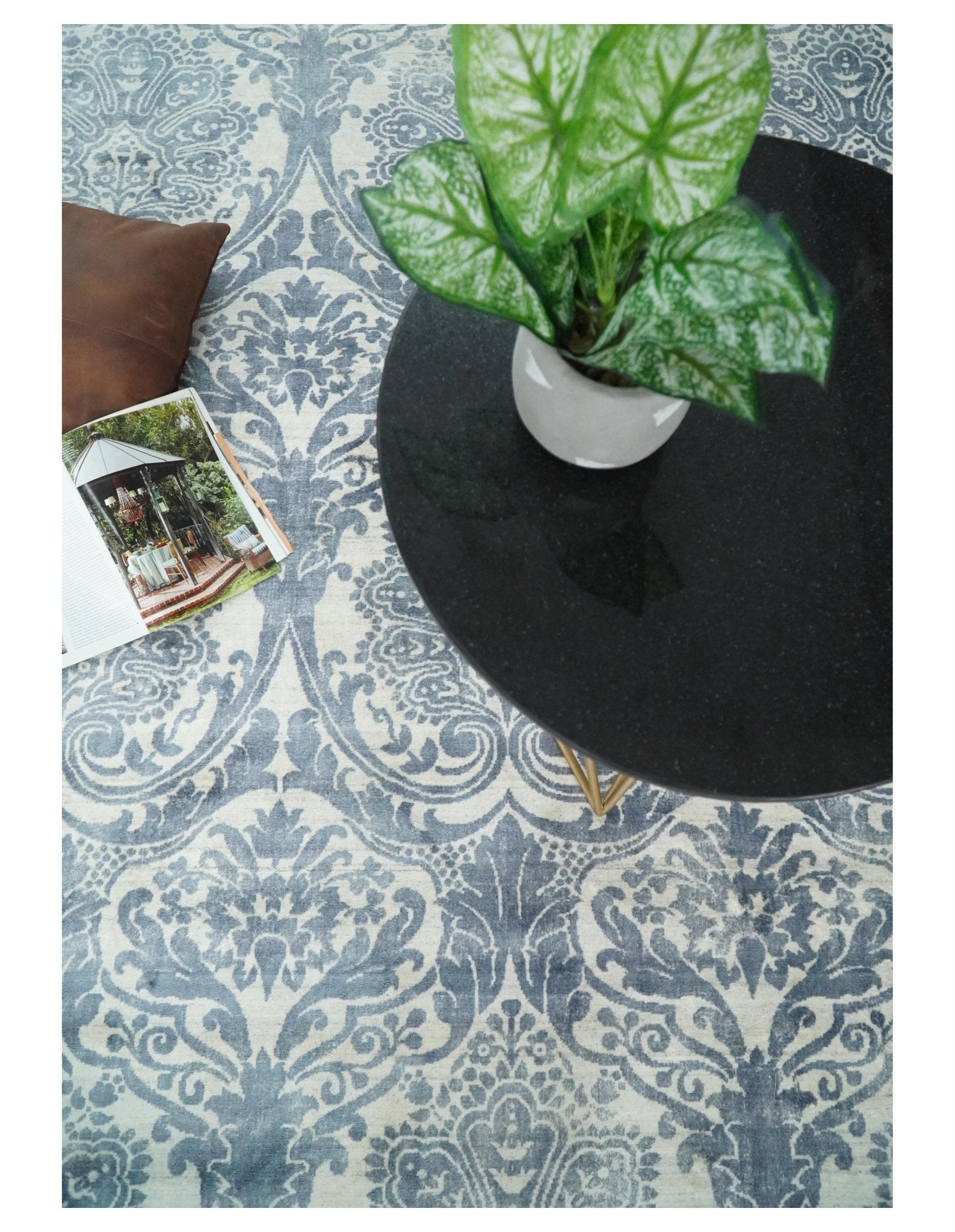 The rug is made in Bhadohi, (India) a place that is one of the biggest rug manufacturing cities. Carpet weaving in the region dates back to the 16th century during the reign of Akbar. The skilled artisans of Bhadohi have been carrying the tradition of rug-making for centuries.