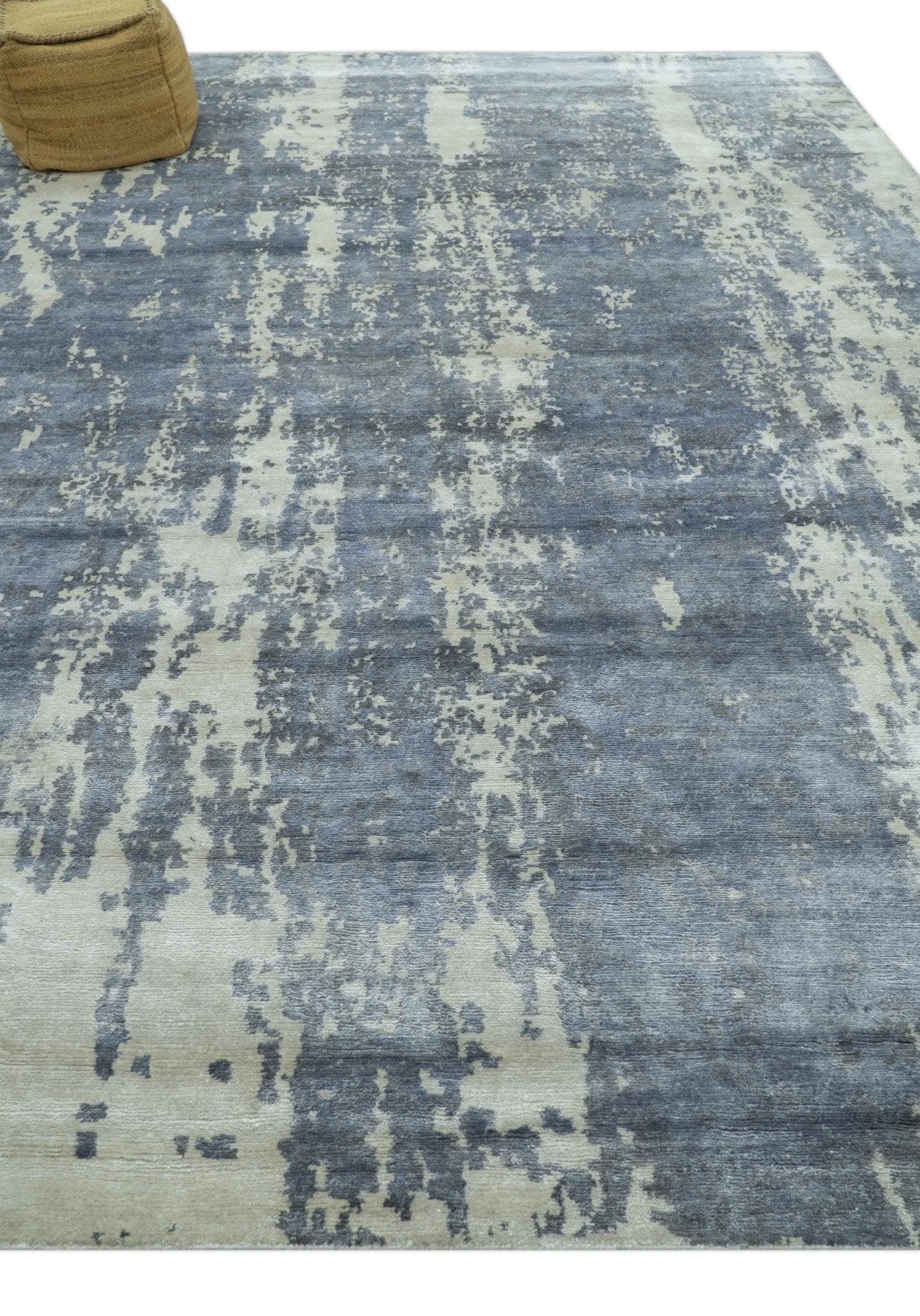Modern Abstract Blue And Ivory Hand Knotted Wool Area Rug