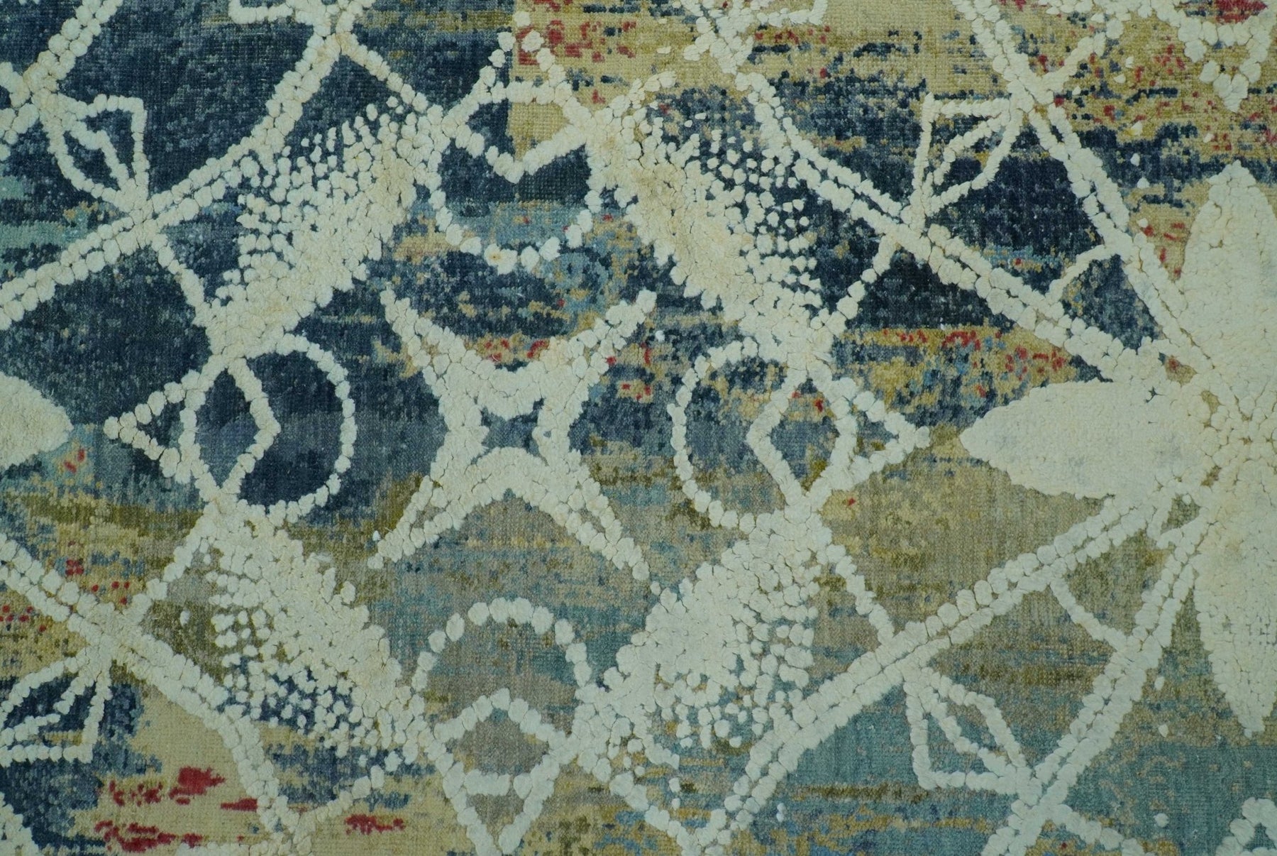 Modern Abstract Design Blue And Beige Hand Knotted 8x10 Wool And Real Silk Area Rug