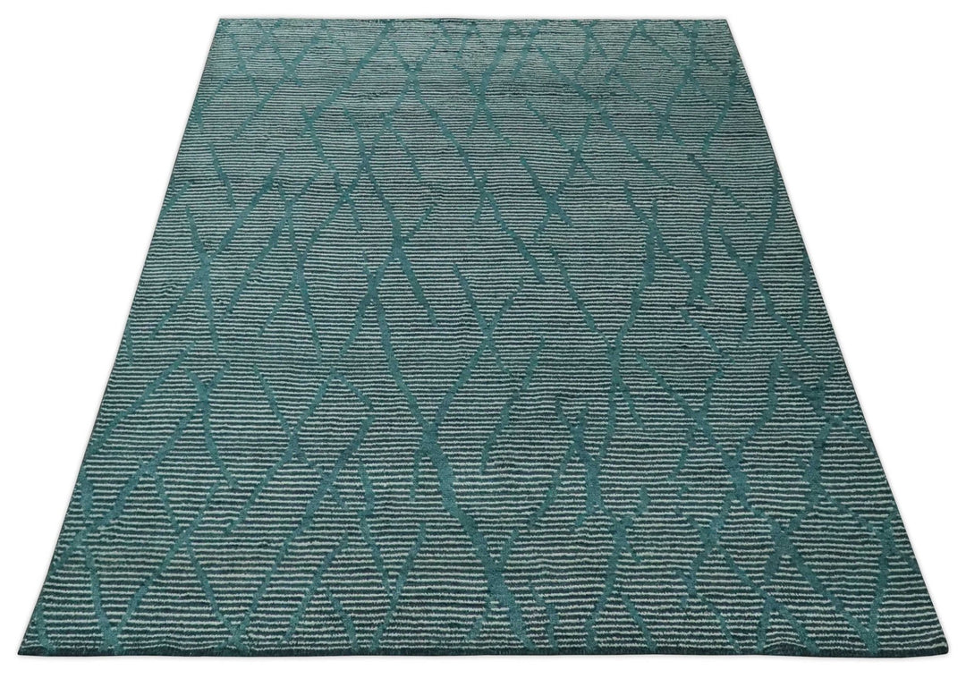 Custom Made Teal and Ivory Modern Stripes Design Hand Knotted wool Area Rug