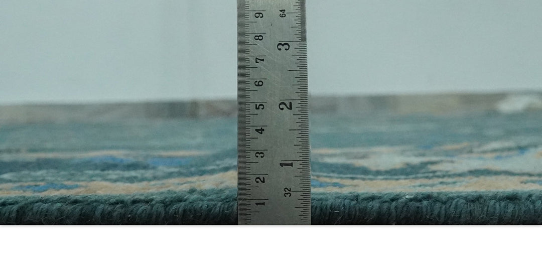 This custom-made hand-knotted Traditional Heriz wool rug features a stunning color combination of teal, blue, peach, and silver. Made with high-quality materials, this rug is both luxurious and durable. Add a touch of elegance to any room with this unique and expertly crafted piece.