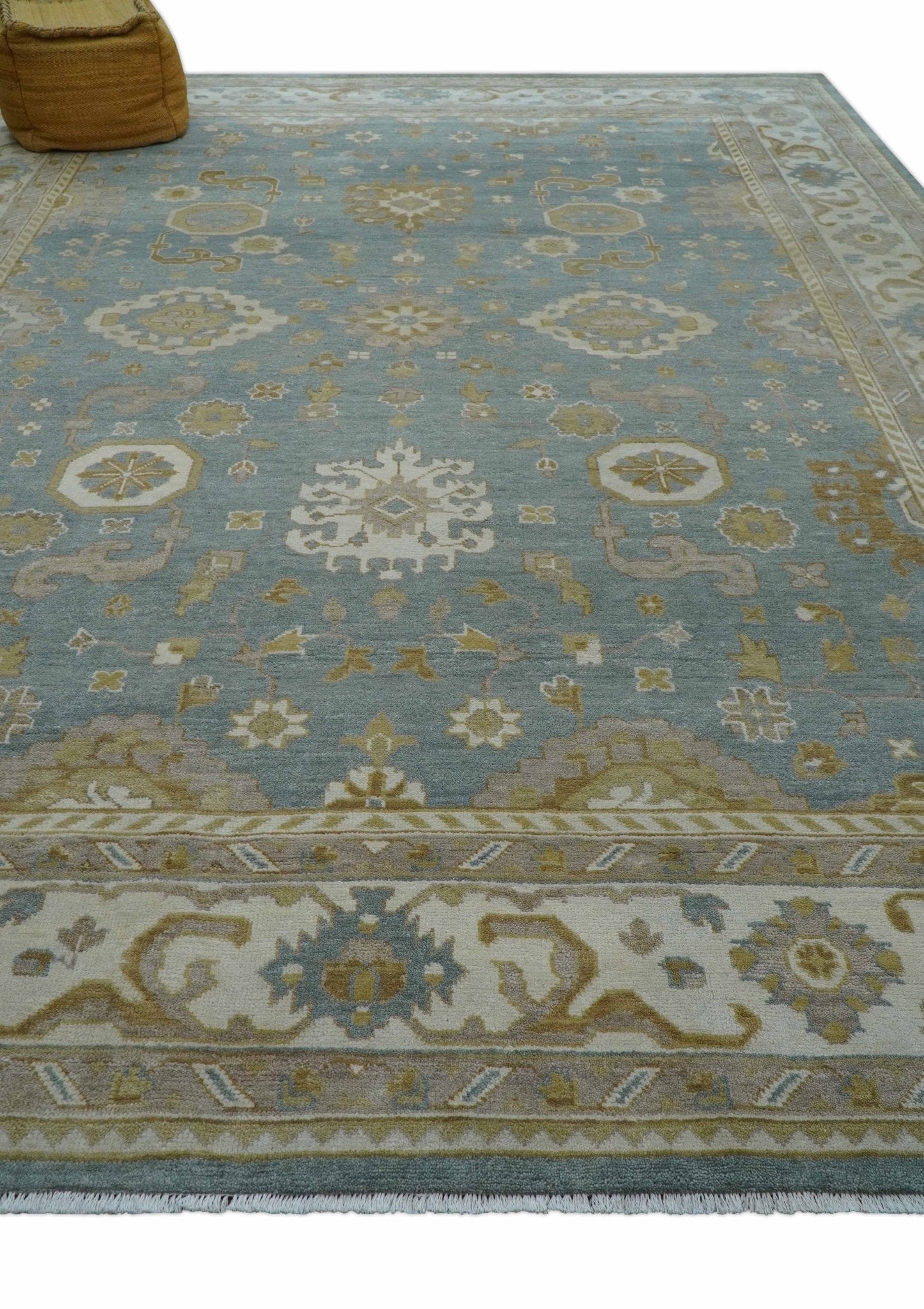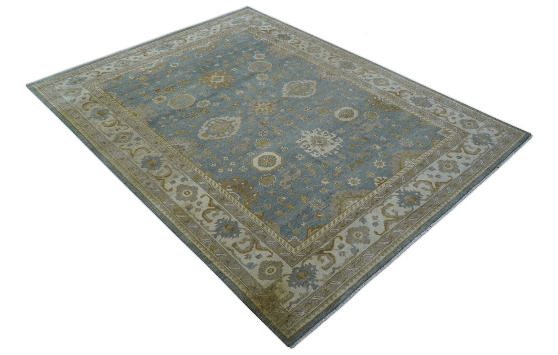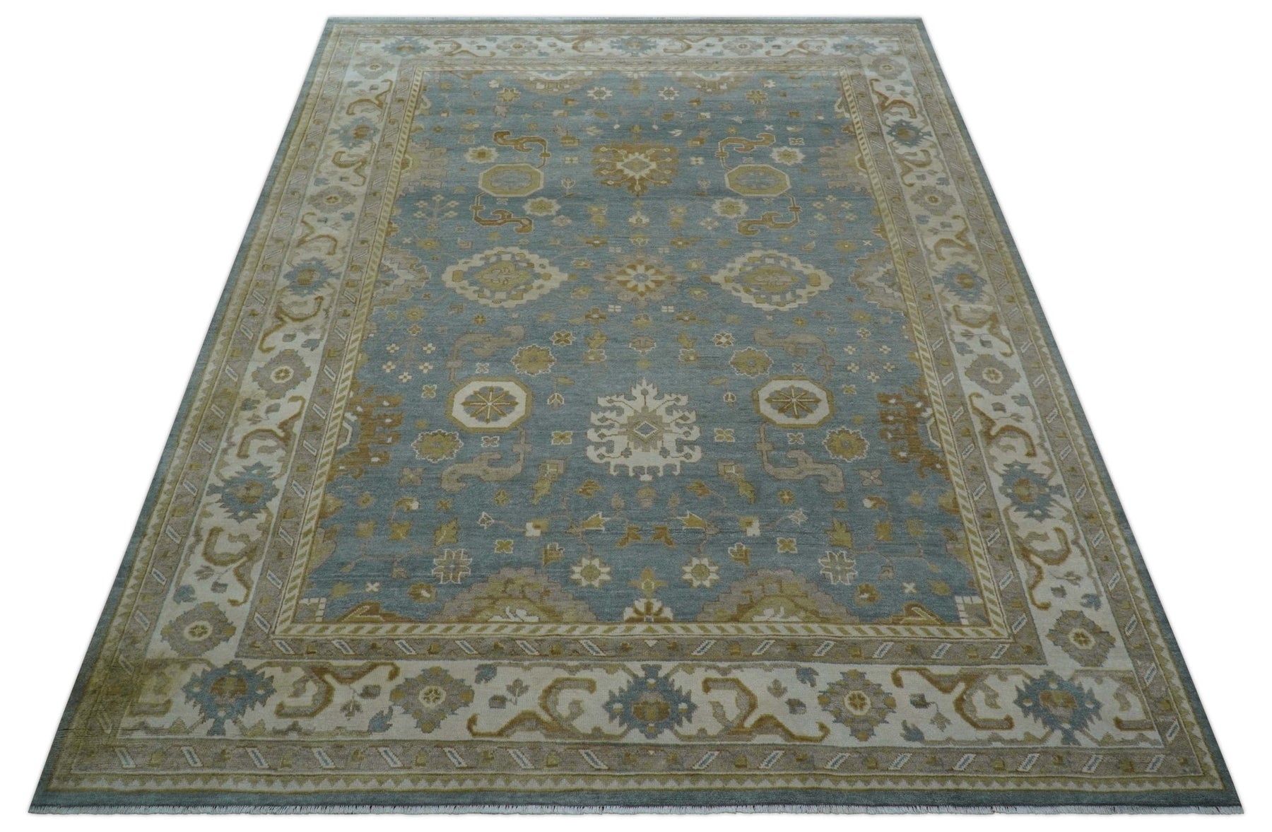 Traditional Oushak Design Blue And Beige 10x14 Hand Knotted Wool Rug