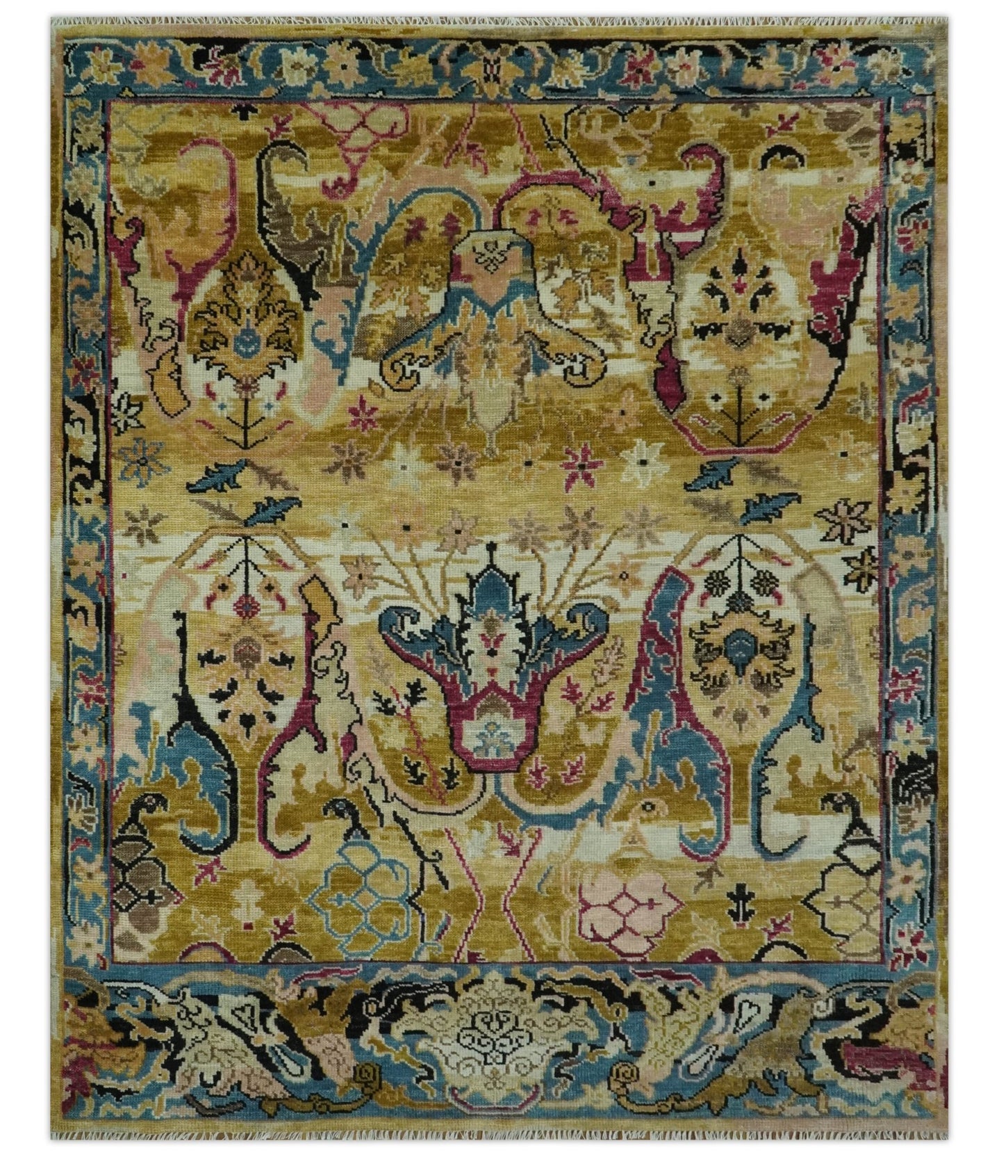 Custom Made Mustard and Teal transitional Dragon Oushak wool area rug