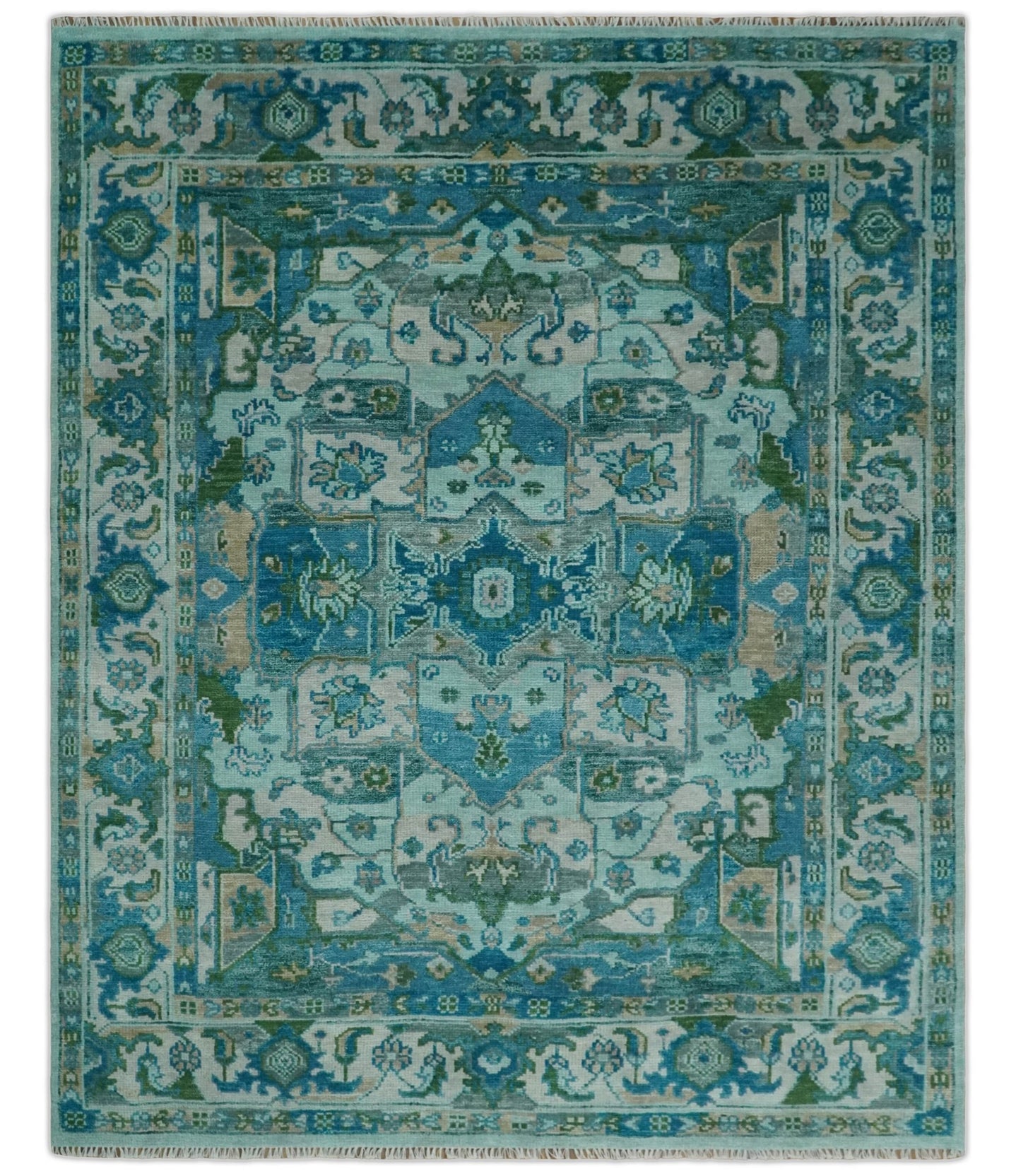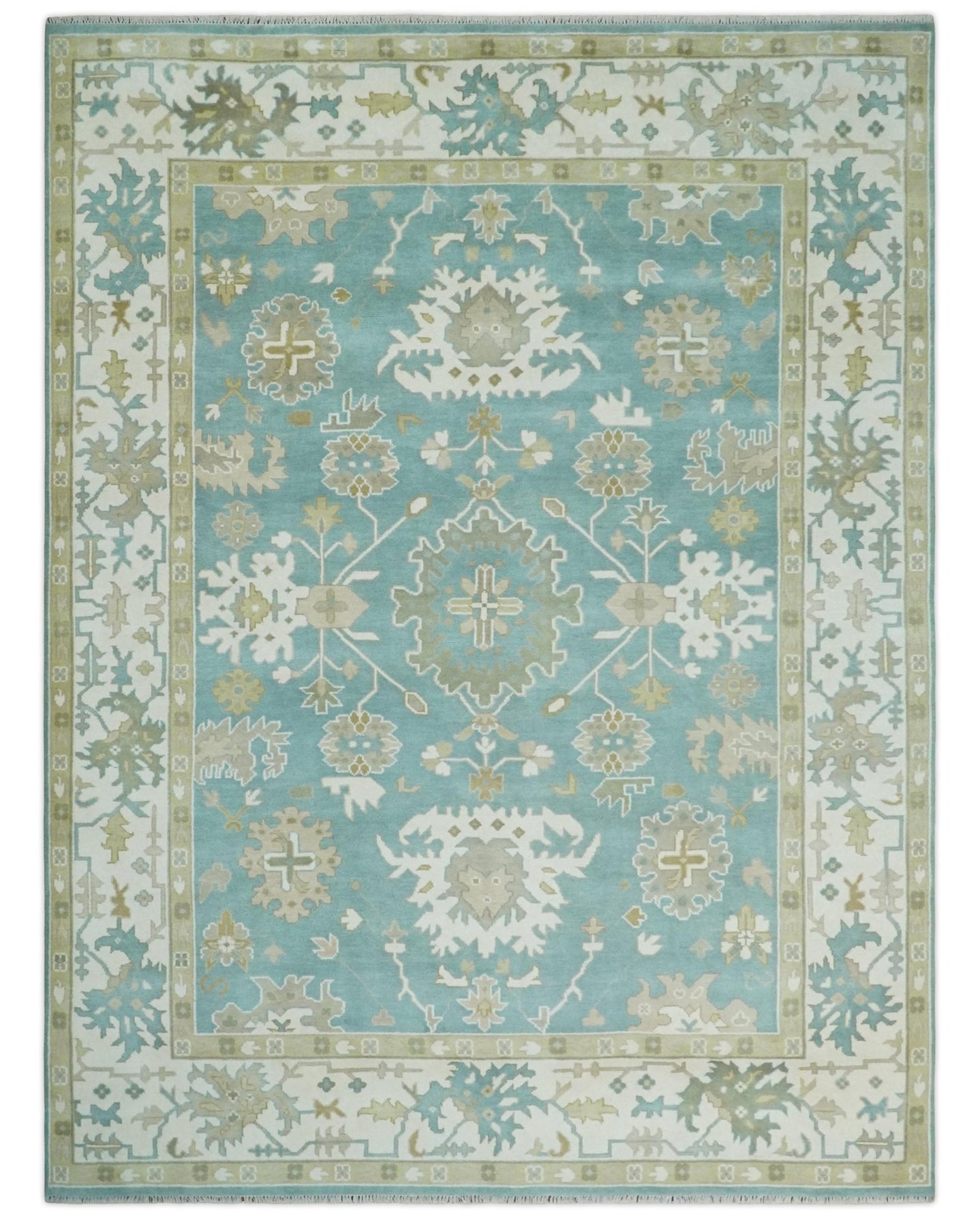 Hand Knotted Oriental Oushak Teal, Ivory and Beige Wool Area Rug