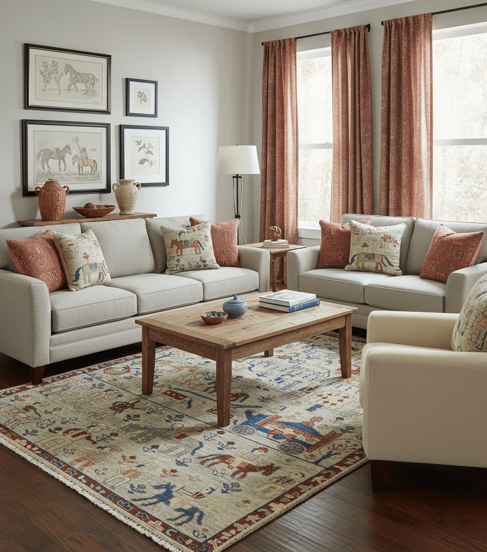 Expertly crafted from 100% wool, this custom-made area rug features a beautifully hand-knotted design in shades of green beige, rust, and blue, showcasing traditional folk art elements. Experience the luxurious softness and durability of wool while adding a unique touch to your decor.
