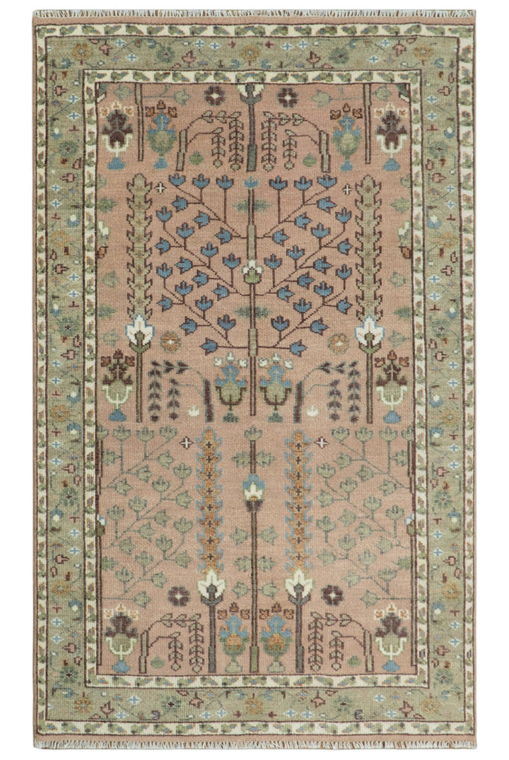 This exquisite rug features a harmonious blend of muted pink and sage green, creating a soft, inviting ambiance. Intricate floral and vine motifs, elegantly arranged in symmetrical patterns, evoke the charm of traditional Persian designs. The central field is accentuated by delicate tulip-like shapes in earthy tones of blue, brown, and white, adding depth and contrast. The border is framed with a lush green border adorned with small floral accents. Crafted with a luxurious, plush texture, this rug is a timeless piece that elevates any space.