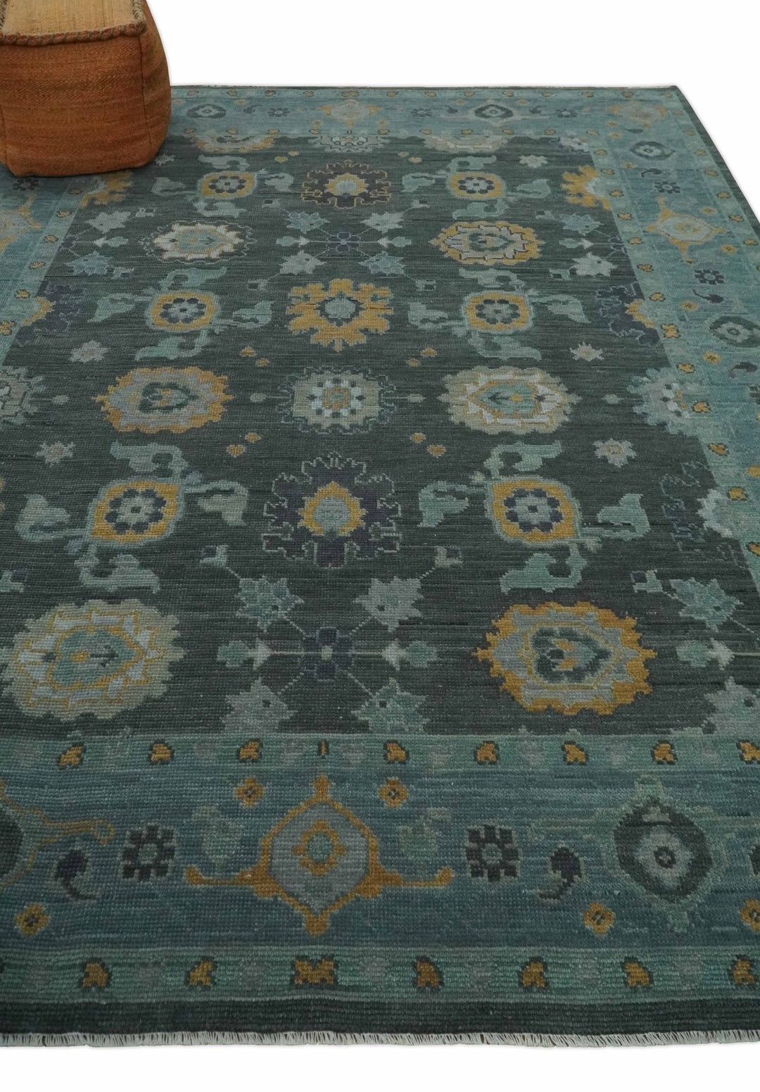 Hand Knotted Charcoal and Aqua Traditional Multi Size Oushak Wool Area Rug