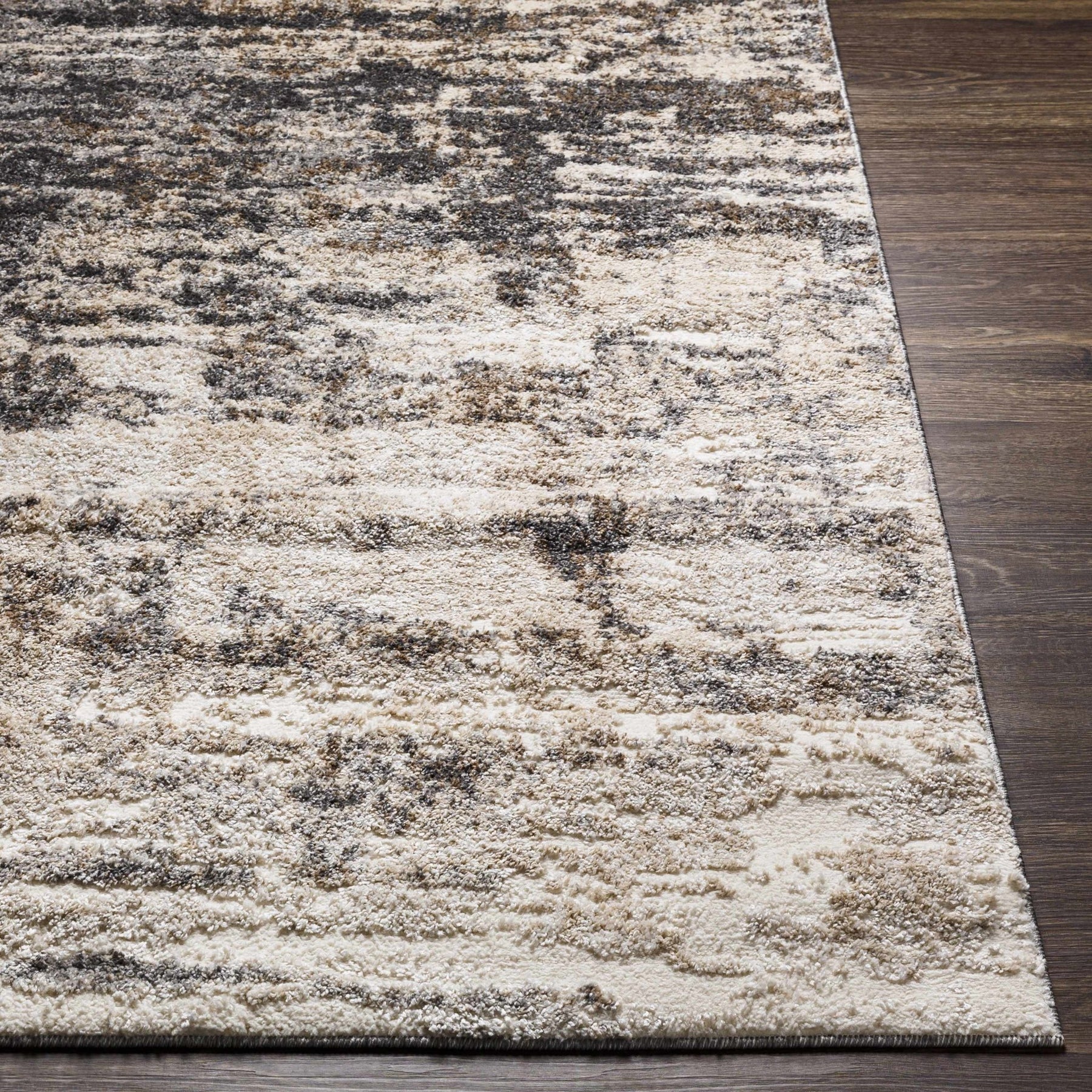 This contemporary area rug features an abstract pattern blending charcoal and beige hues. Its neutral palette seamlessly integrates into modern interiors, delivering sophisticated style while anchoring living spaces with understated visual depth and refinement.