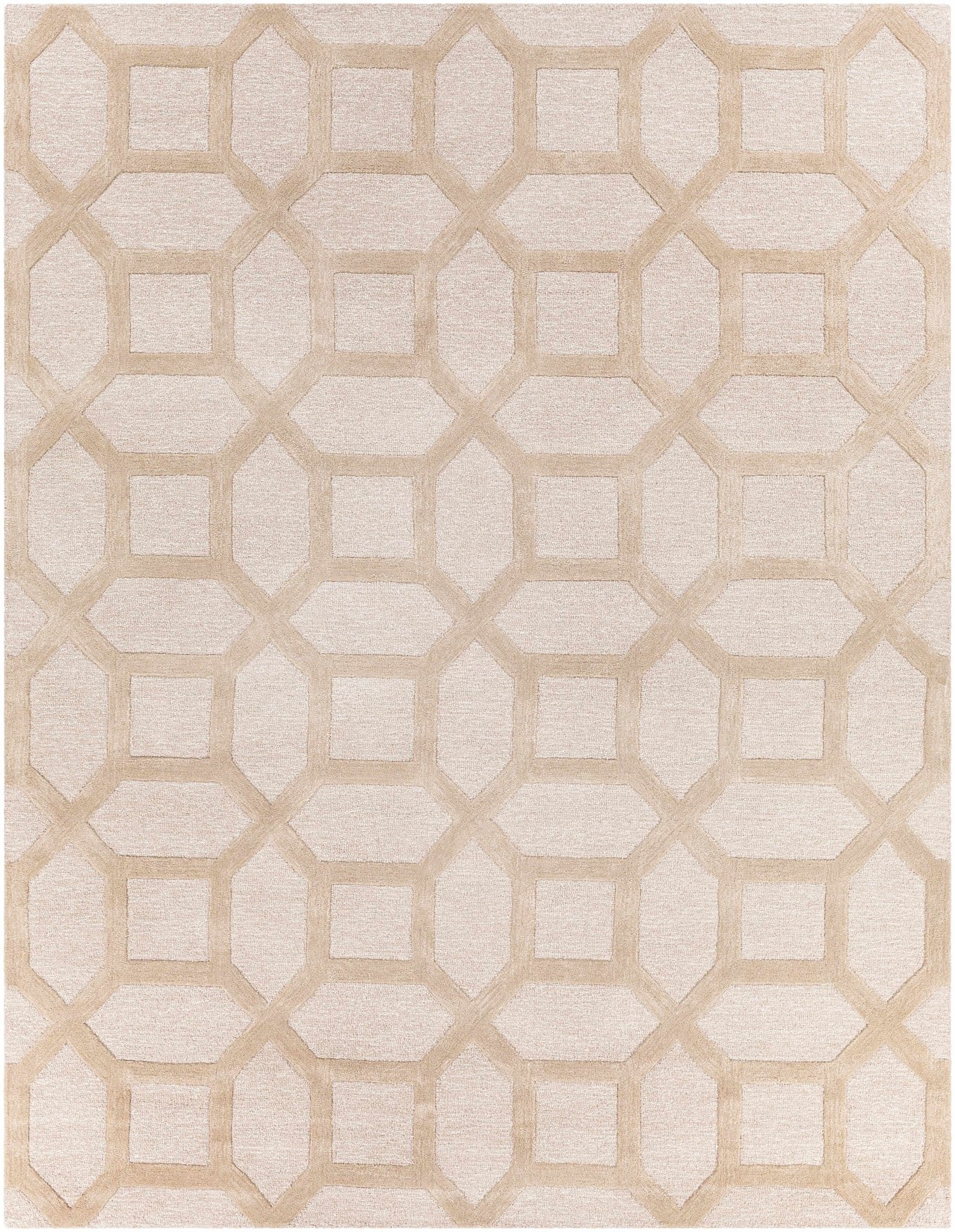 Elevate your space with this hand-tufted contemporary area rug from the Dodgertown collection. Crafted from premium 70% wool and 30% viscose blend, it features geometric patterns in soft ivory, beige, and peach tones. Medium pile construction ensures comfort and durability for any room.
