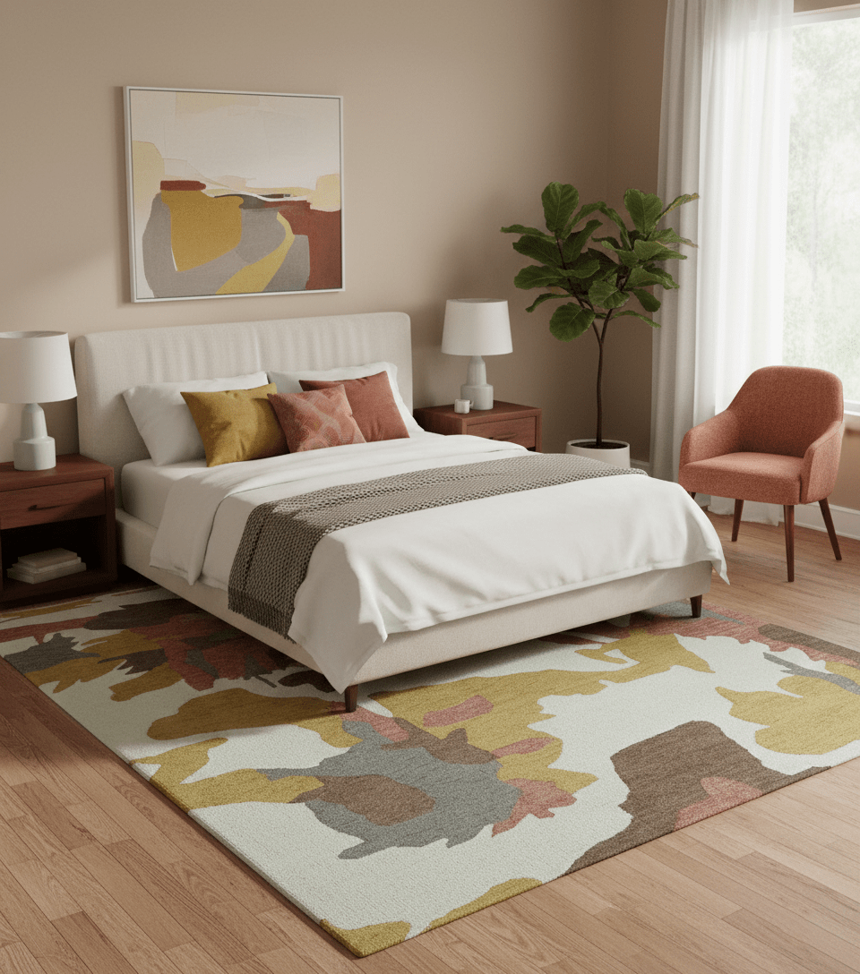 This custom-made hand-tufted wool area rug features a contemporary abstract design in ivory, yellow, and rust tones. Expertly crafted, it offers durable softness and adds a sophisticated artistic touch to any living space. Its unique color palette complements modern interiors while providing lasting quality and comfort underfoot.