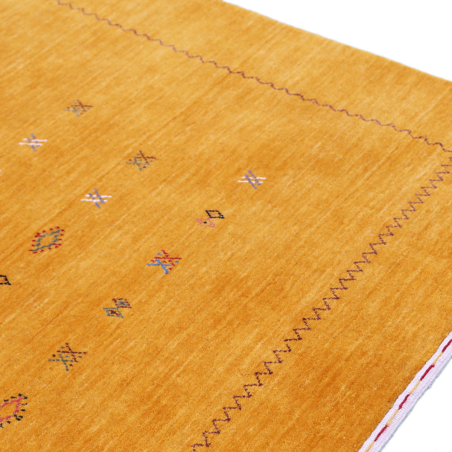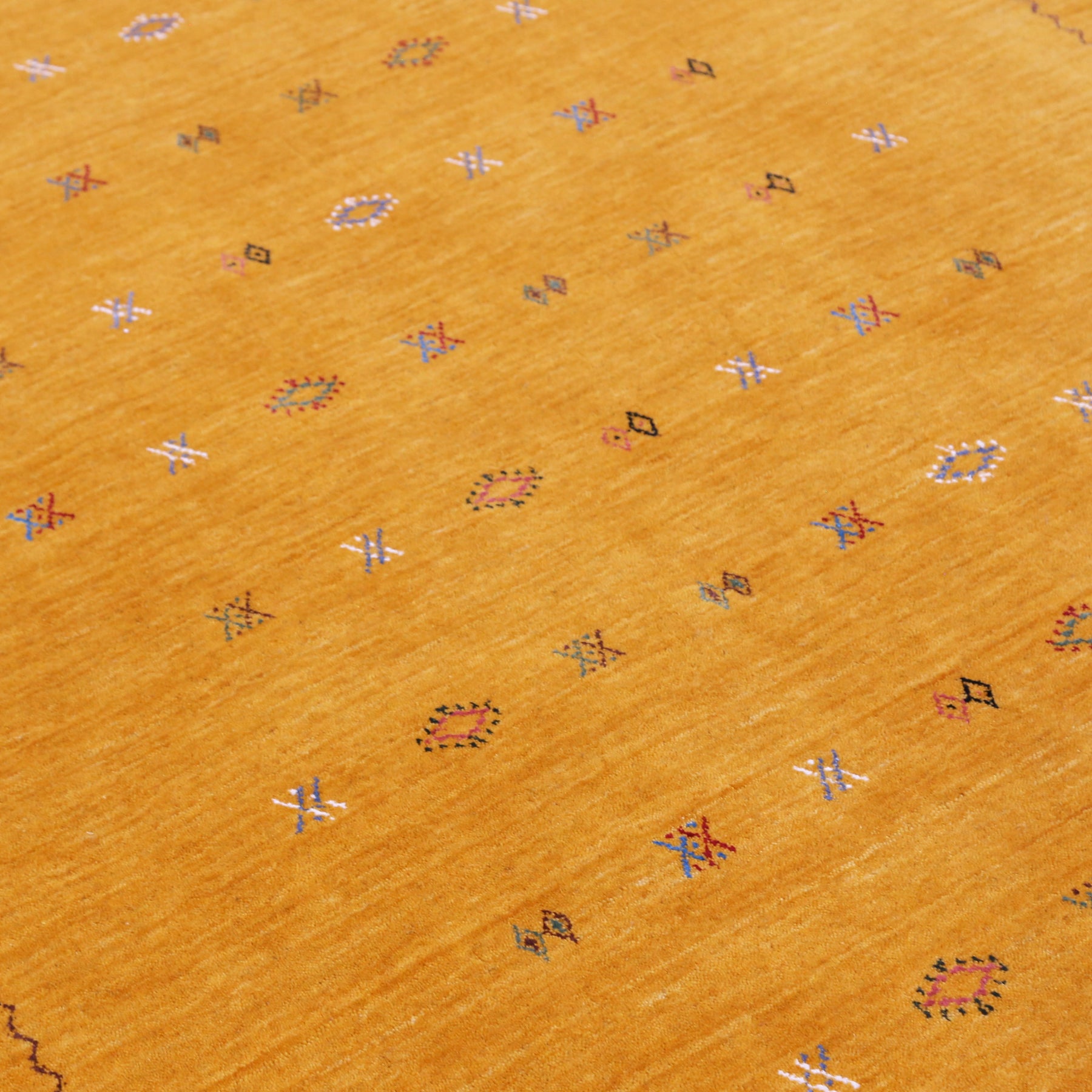 This hand-loomed wool area rug showcases a sophisticated gold tribal center medallion, reflecting centuries of weaving heritage. The natural wool construction provides exceptional durability and comfort underfoot, making it an investment piece that enhances any sophisticated interior design scheme.