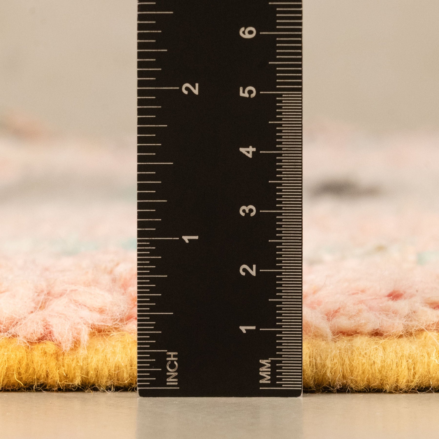 This hand-knotted wool rug combines Moroccan design heritage with contemporary sensibilities, rendered in warm peach tones. The 5x8.5-foot size suits diverse room layouts while the premium wool fiber ensures lasting softness and structural integrity. A sophisticated foundation piece that bridges traditional artistry with modern interior aesthetics.