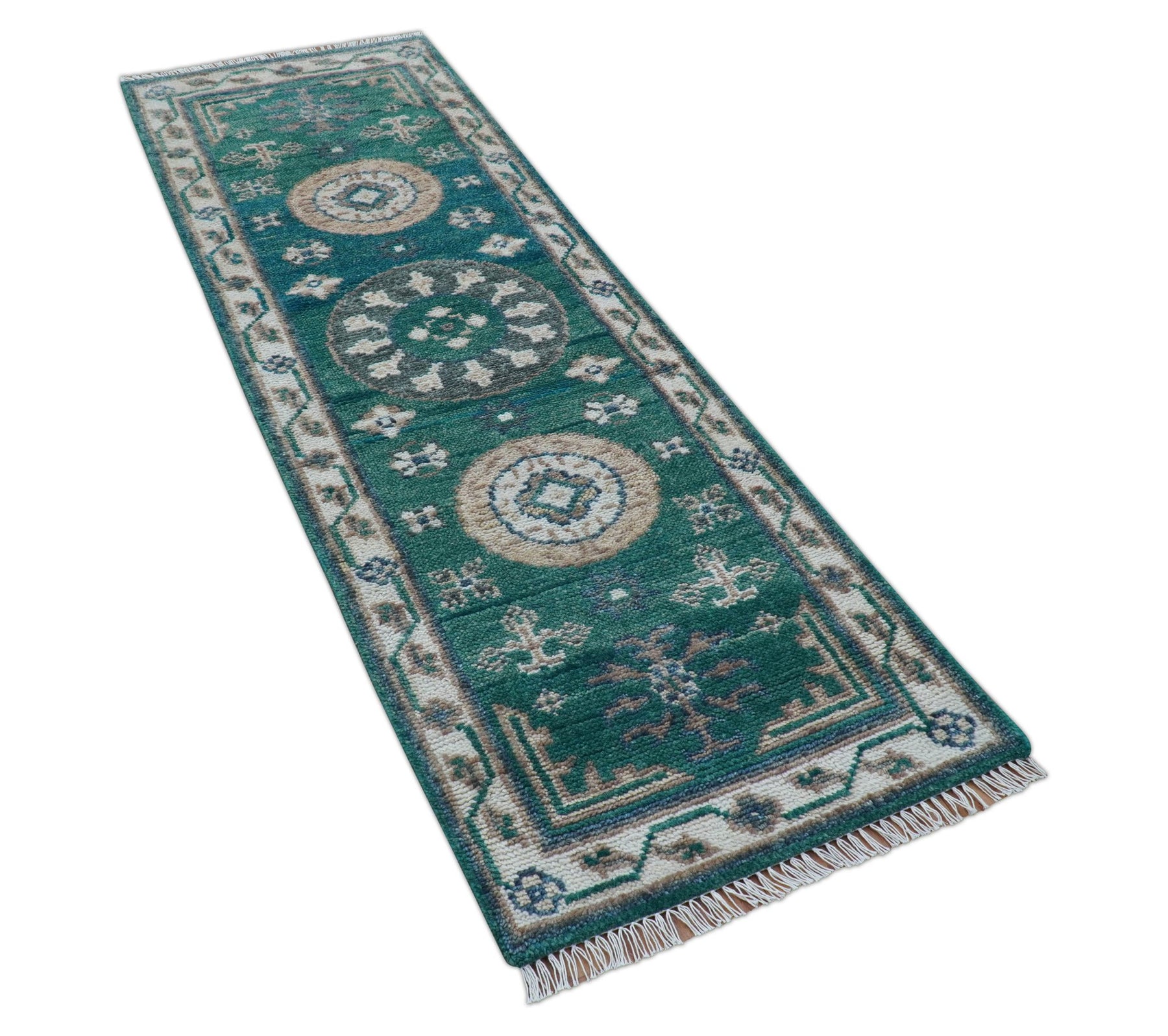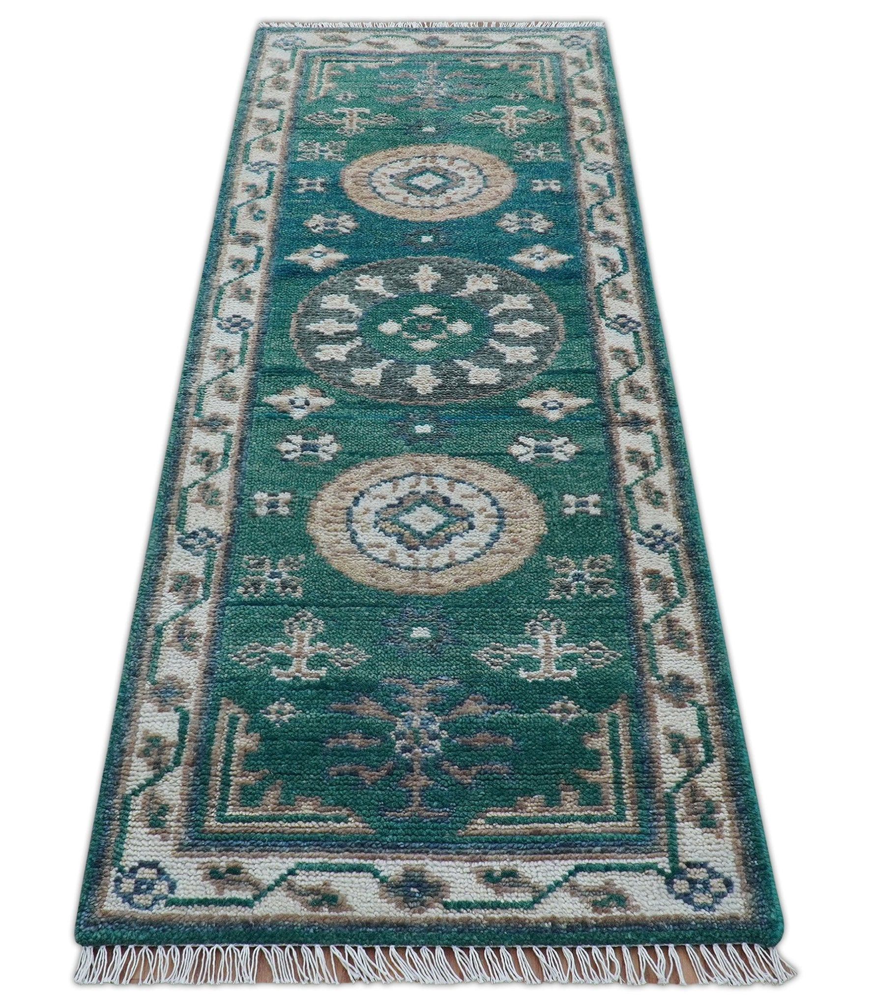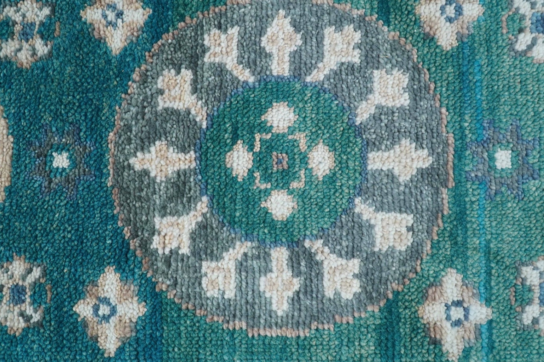 This hand-knotted wool runner measures 2.6x8 feet and displays the intricate symmetrical patterns defining traditional Khotan design. Rich teal hues create visual warmth while the premium wool construction withstands daily use with grace. An investment piece that anchors entryways and corridors with authentic craftsmanship and timeless aesthetic appeal.