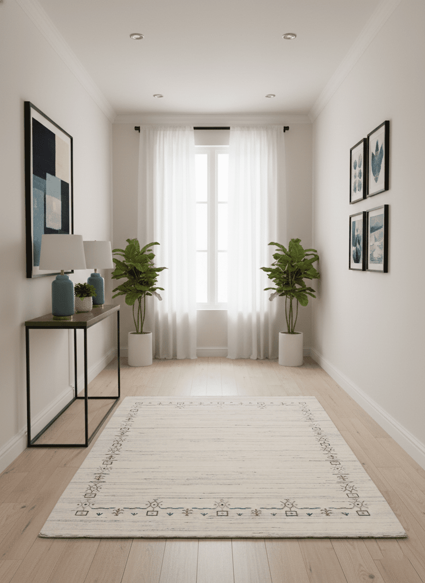 This hand-loomed wool rug showcases a sophisticated ivory and blue tribal border pattern. Its durable construction ensures long-lasting use, while the natural wool offers soft comfort underfoot. Ideal for enhancing room décor with subtle texture and classic, artisanal style.