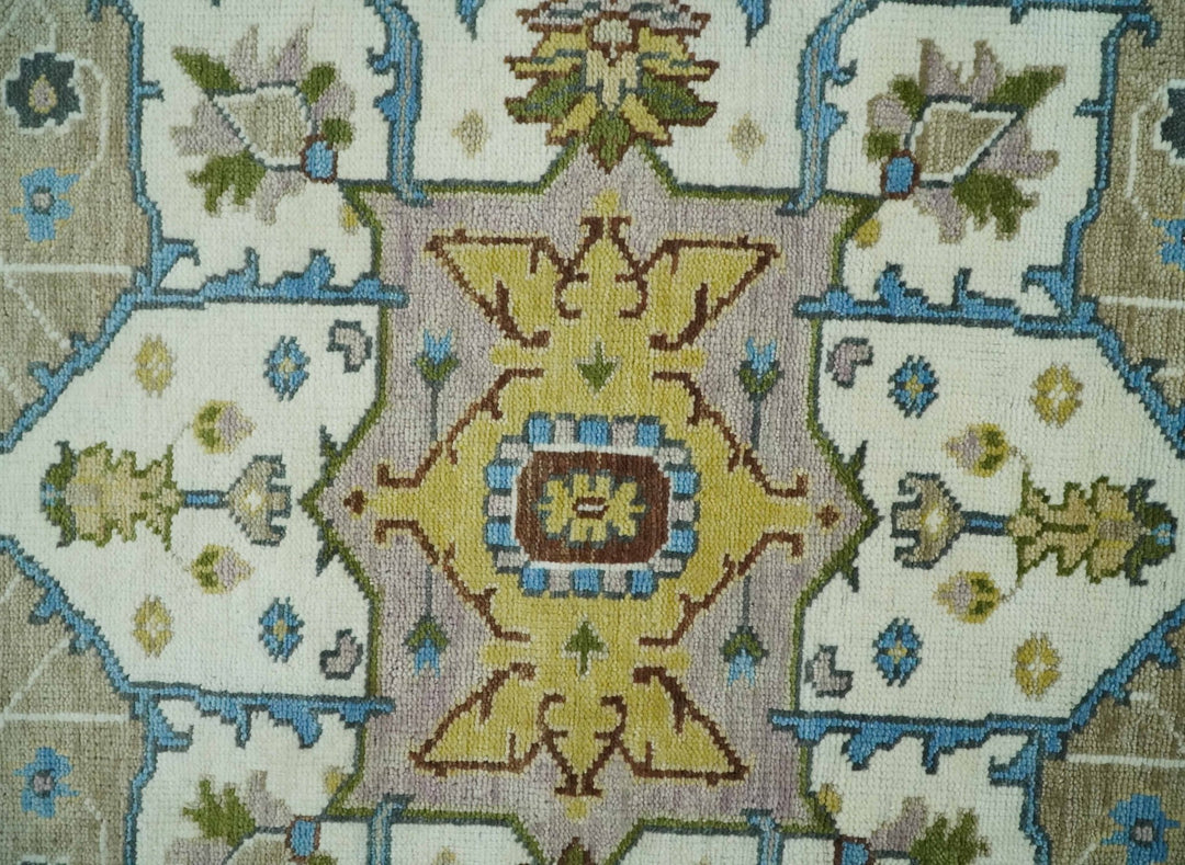 Custom Made Hand Knotted Ivory, Camel and Teal Modern Heriz Serapi Wool Rug