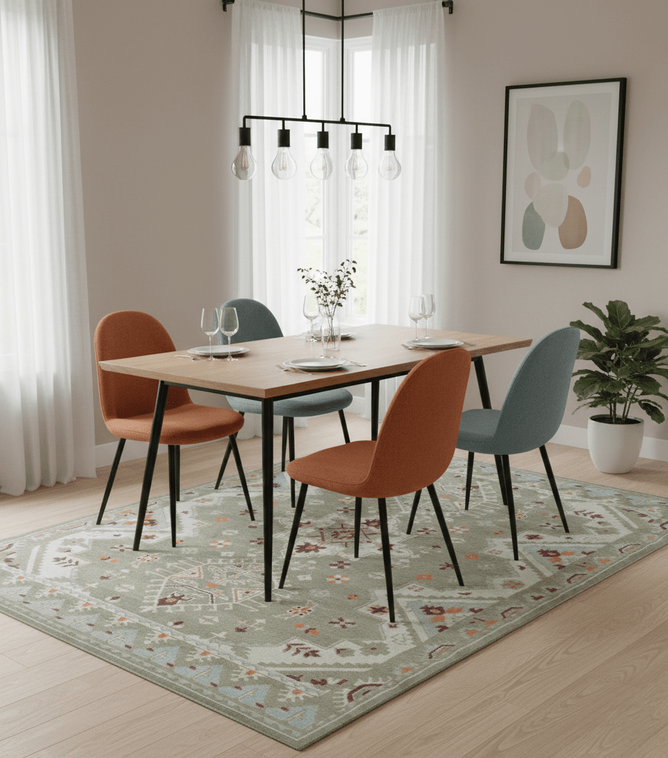 This exquisite rug boasts a sophisticated blend of muted greens and earth tones, accentuated by vibrant splashes of orange and purple. The intricate geometric motifs are inspired by traditional tribal patterns, evoking a sense of rich cultural heritage. The soft, plush texture invites luxury underfoot, while the symmetrical design adds elegance and balance. Ideal for upscale interiors, this rug seamlessly merges timeless artistry with modern style, making it a standout decor piece.