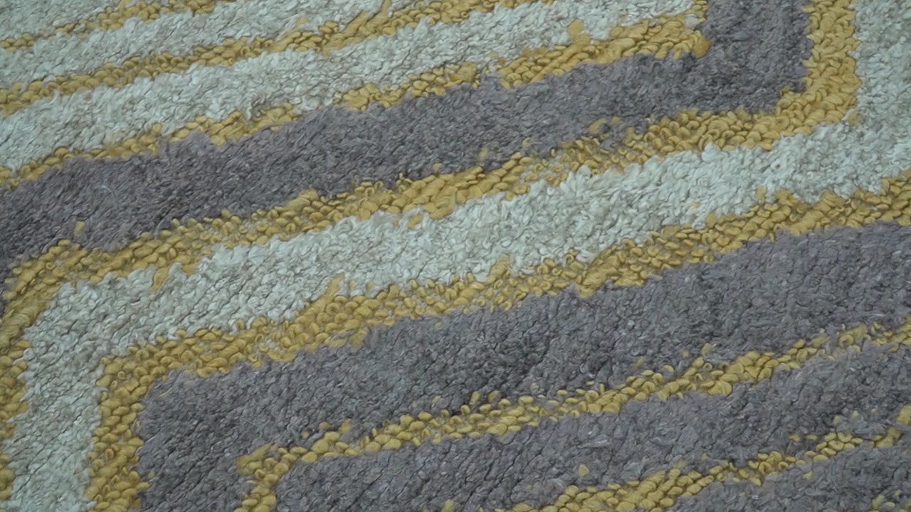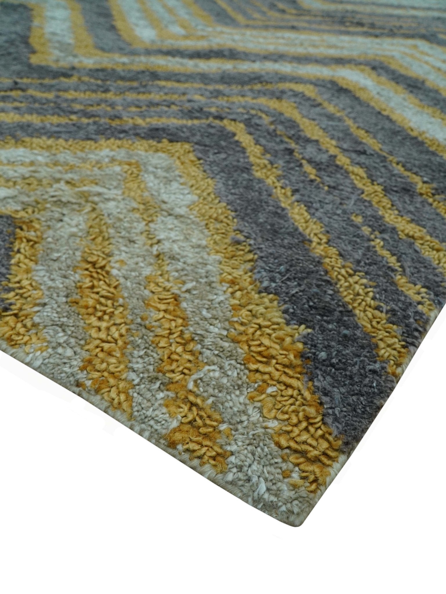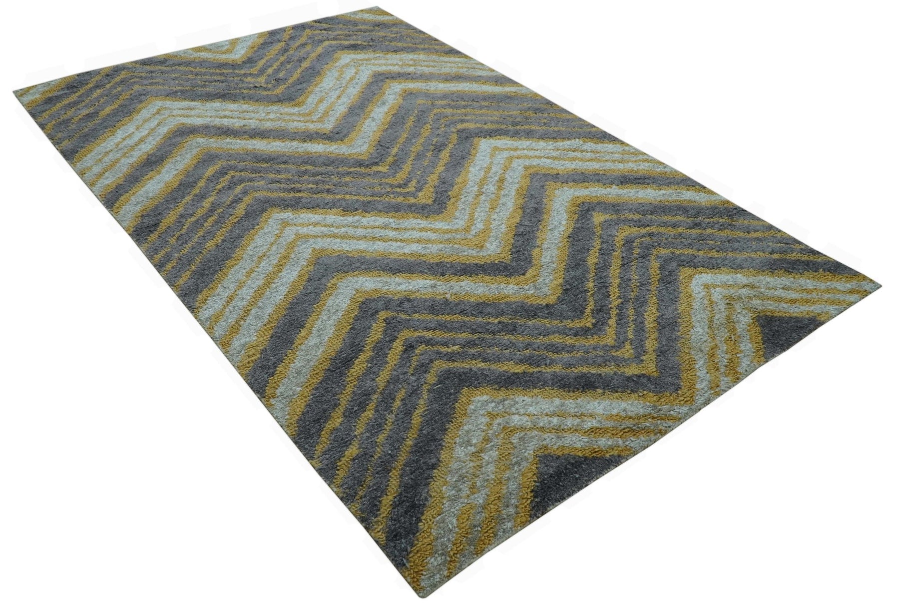 This Modern Chevron Design Gold And Beige 5.6x8 Hand Knotted Bamboo Silk Area Rug is a stunning addition to any room. The intricate hand-knotted design features a sleek and modern chevron pattern in gold and beige tones. Made from luxurious bamboo silk, this rug adds an elegant touch to your space while providing softness and durability. Perfect for any style of decor, this rug is sure to impress.