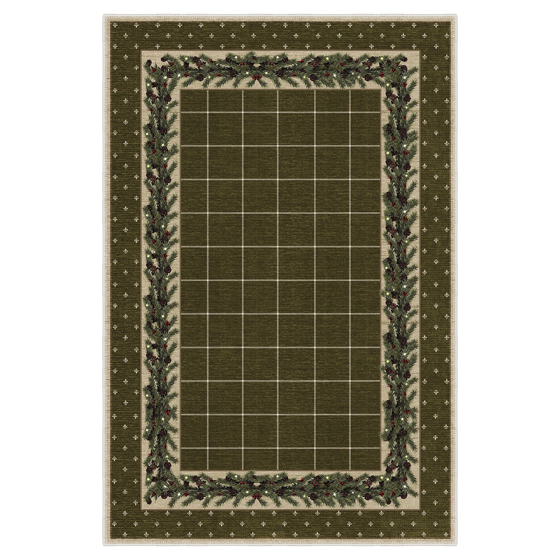 Elegant green cotton area rug showcasing understated Christmas elements with modern sensibility. Fully machine washable for hassle-free maintenance. Delivers sophisticated holiday ambiance while providing durable, practical flooring suited to contemporary interiors year-round.