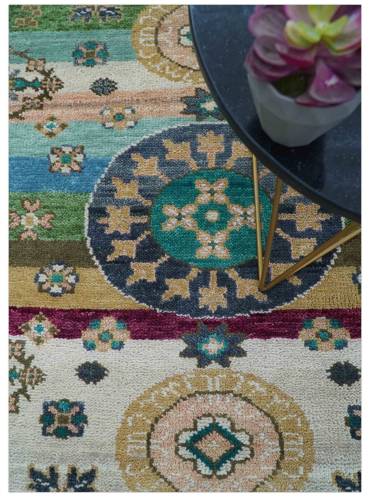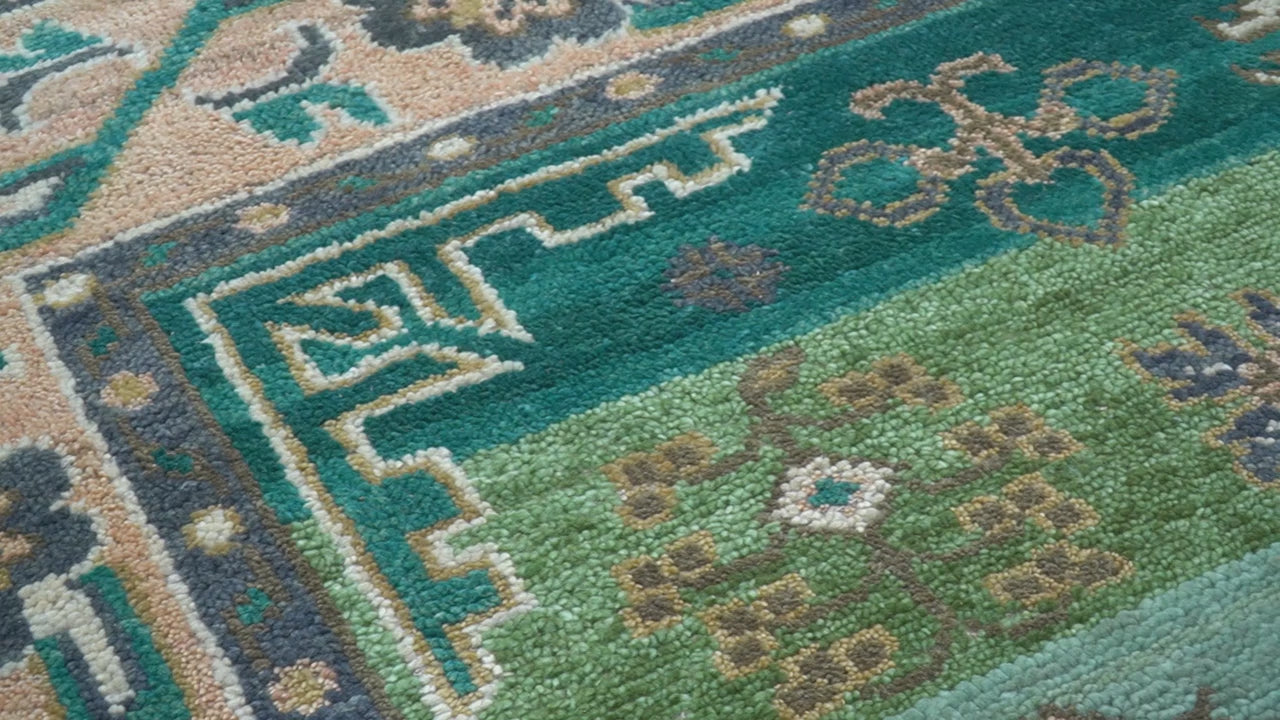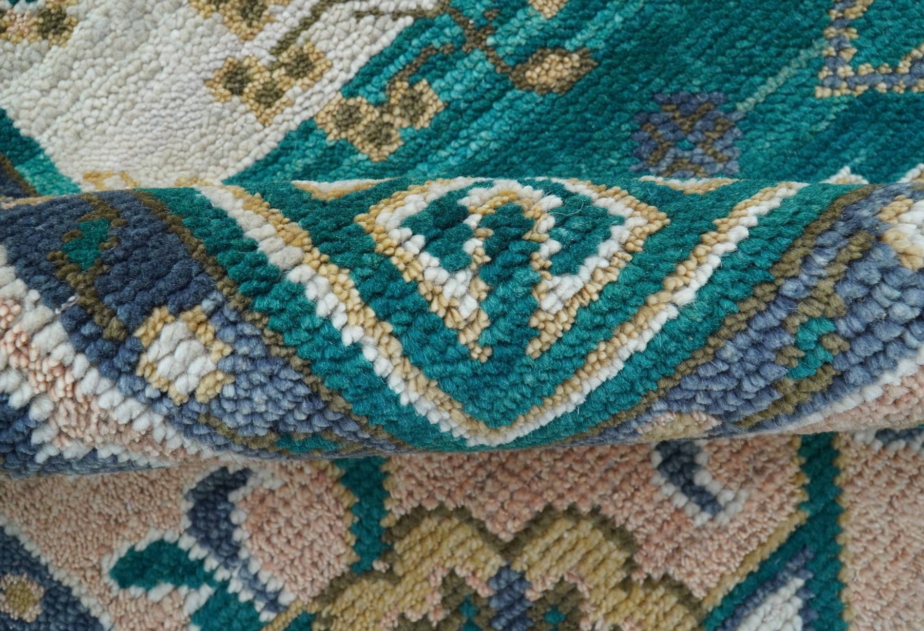 Ready to Ship Peach And Teal Traditional Hand Knotted 8x10 Wool Rug
