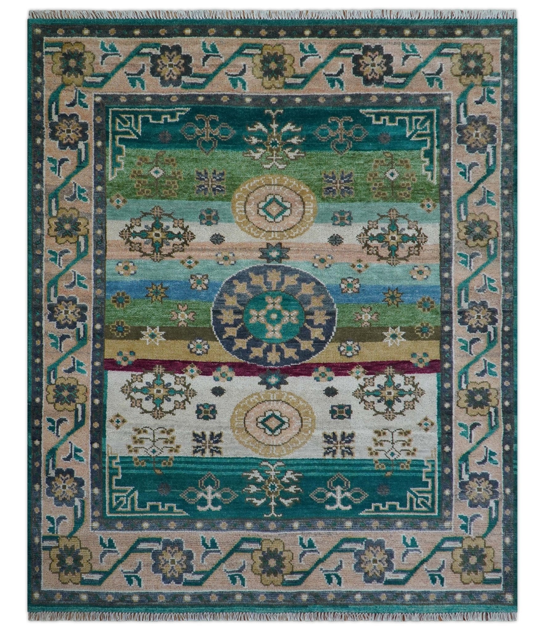 Handcrafted using traditional Khotan techniques, this wool area rug features an exquisite blend of peach and teal tones. The 8x10 dimensions provide substantial coverage for living rooms or bedrooms. Authentic geometric patterns reflect centuries of weaving heritage and enduring design appeal.