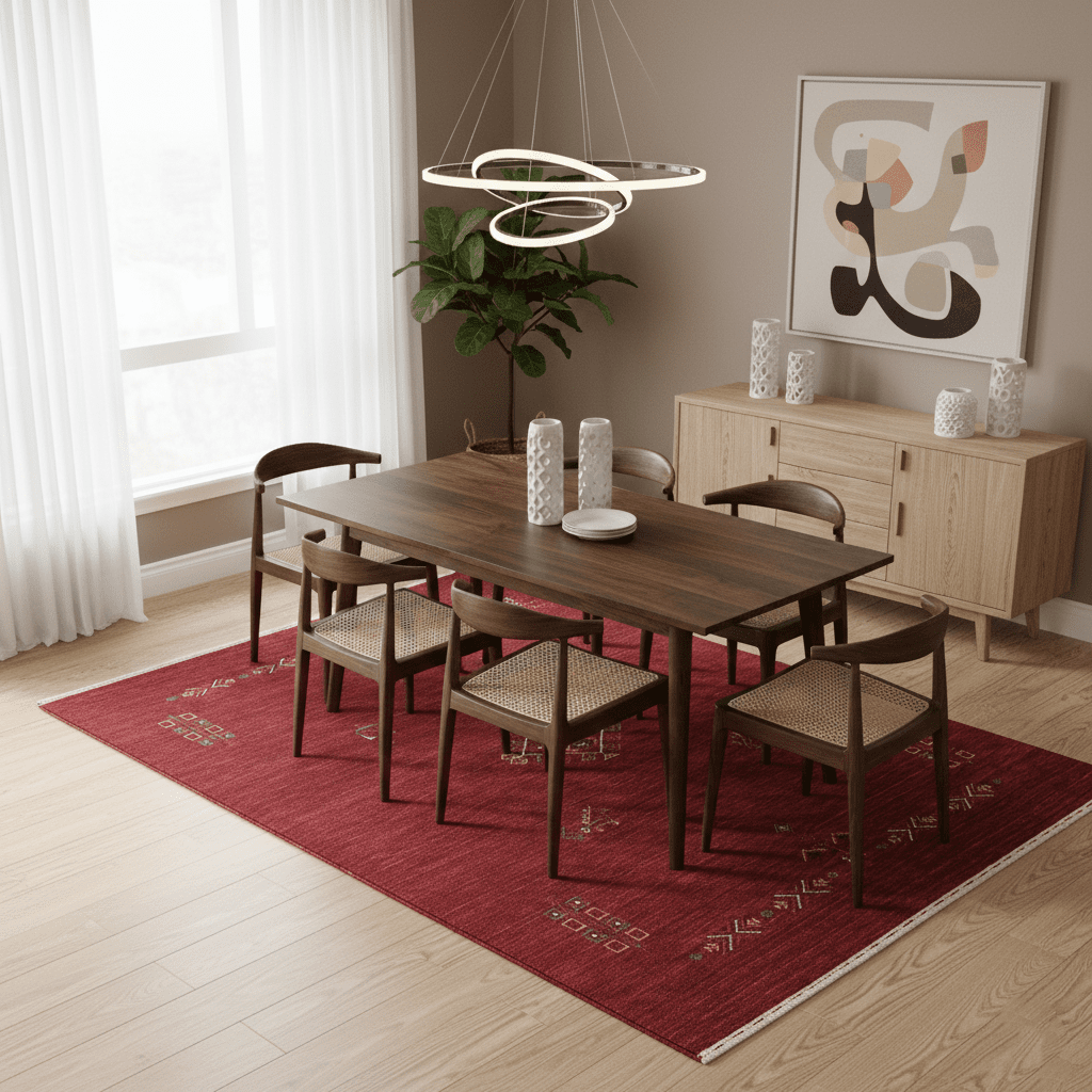 Hand-loomed in pure wool, this area rug showcases a striking red medallion complemented by authentic tribal patterning. Constructed using heritage weaving techniques, it combines substantial durability with visual richness. A distinguished foundation piece that brings genuine cultural artistry and timeless elegance to discerning interiors.