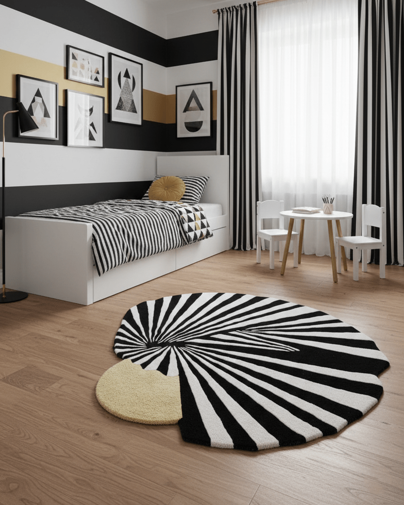 This hand-tufted wool area rug features an intricate sunflare fan pattern in sophisticated black tones. The 5x5 size makes it ideal for defining living spaces or bedrooms. Crafted from premium wool, it offers durability and natural softness underfoot while adding architectural interest to any room's décor.