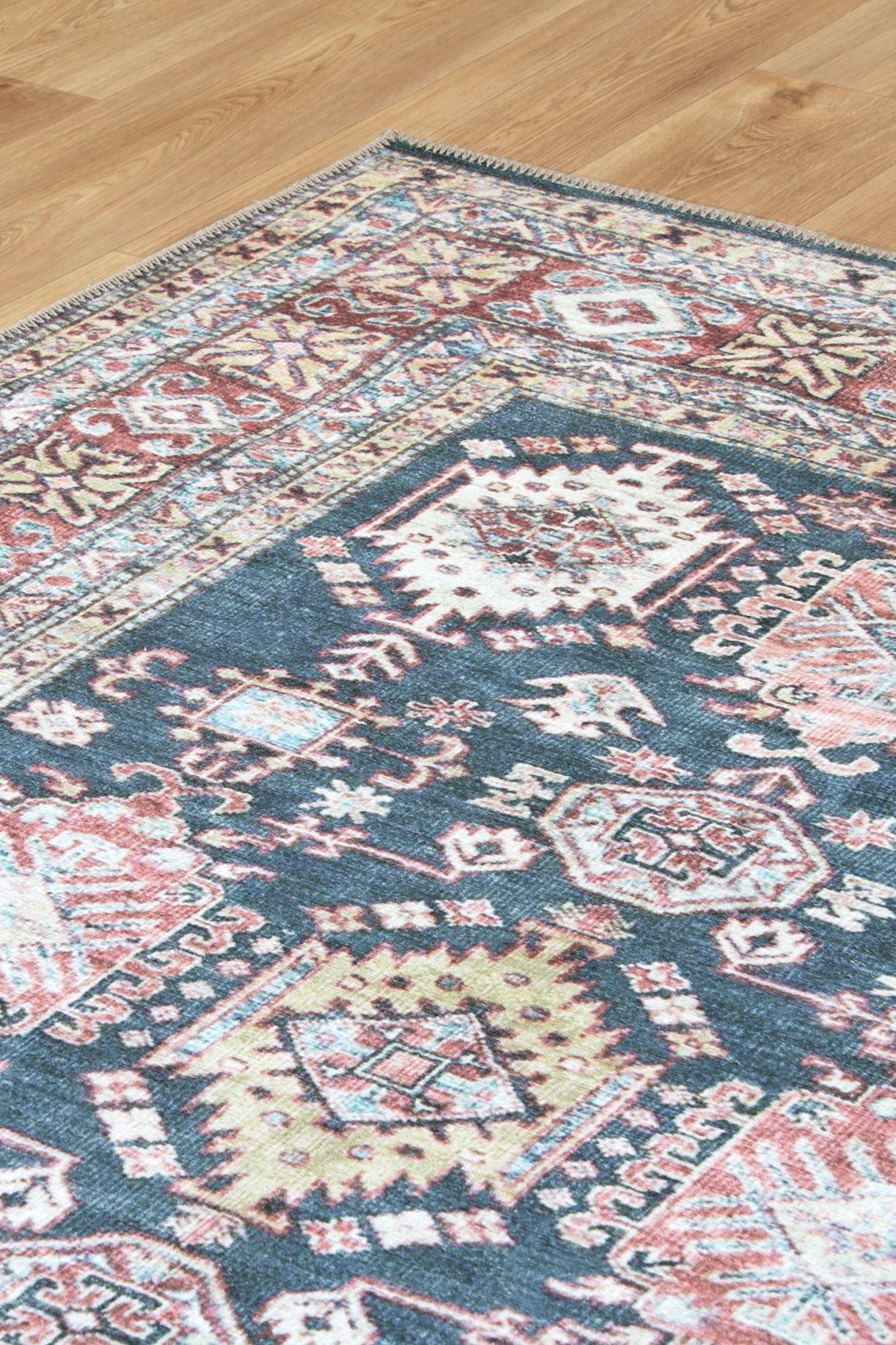 Classic traditional rug featuring complementary blue and rust colorways. Machine washable construction simplifies everyday maintenance and extends longevity. Expertly designed for discerning collectors seeking heritage-inspired aesthetics with modern convenience and lasting durability.