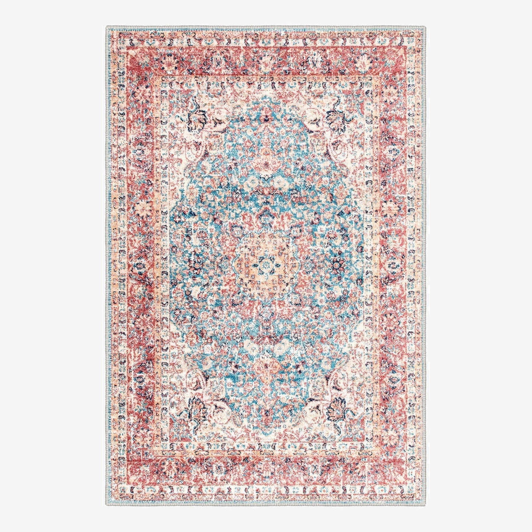 Traditional Rust And Blue Machine Washable Cotton Rug