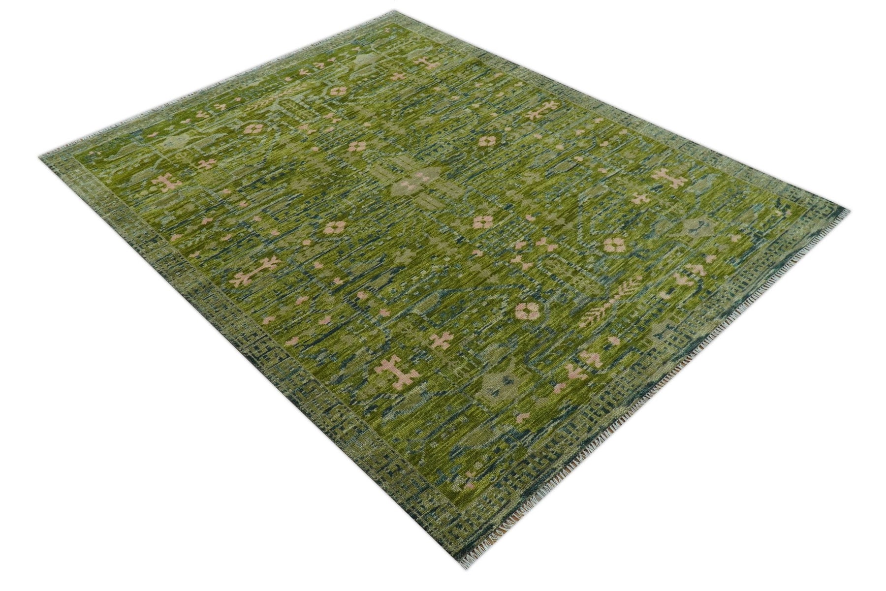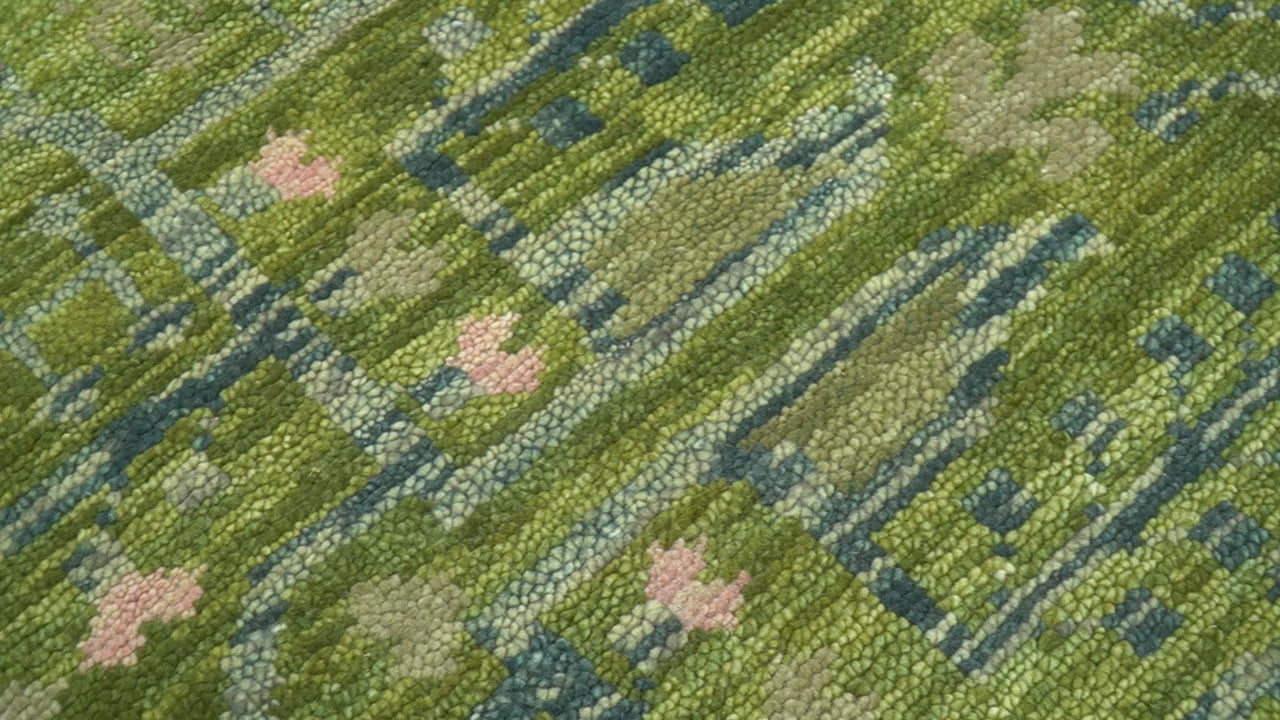 Expertly hand-knotted, this transitional wool rug blends contemporary style with traditional craftsmanship. The striking green and blue color palette creates a sophisticated focal point while the custom-made design ensures exclusivity. Durable wool construction provides natural insulation, sound absorption, and long-lasting beauty for your distinctive space.