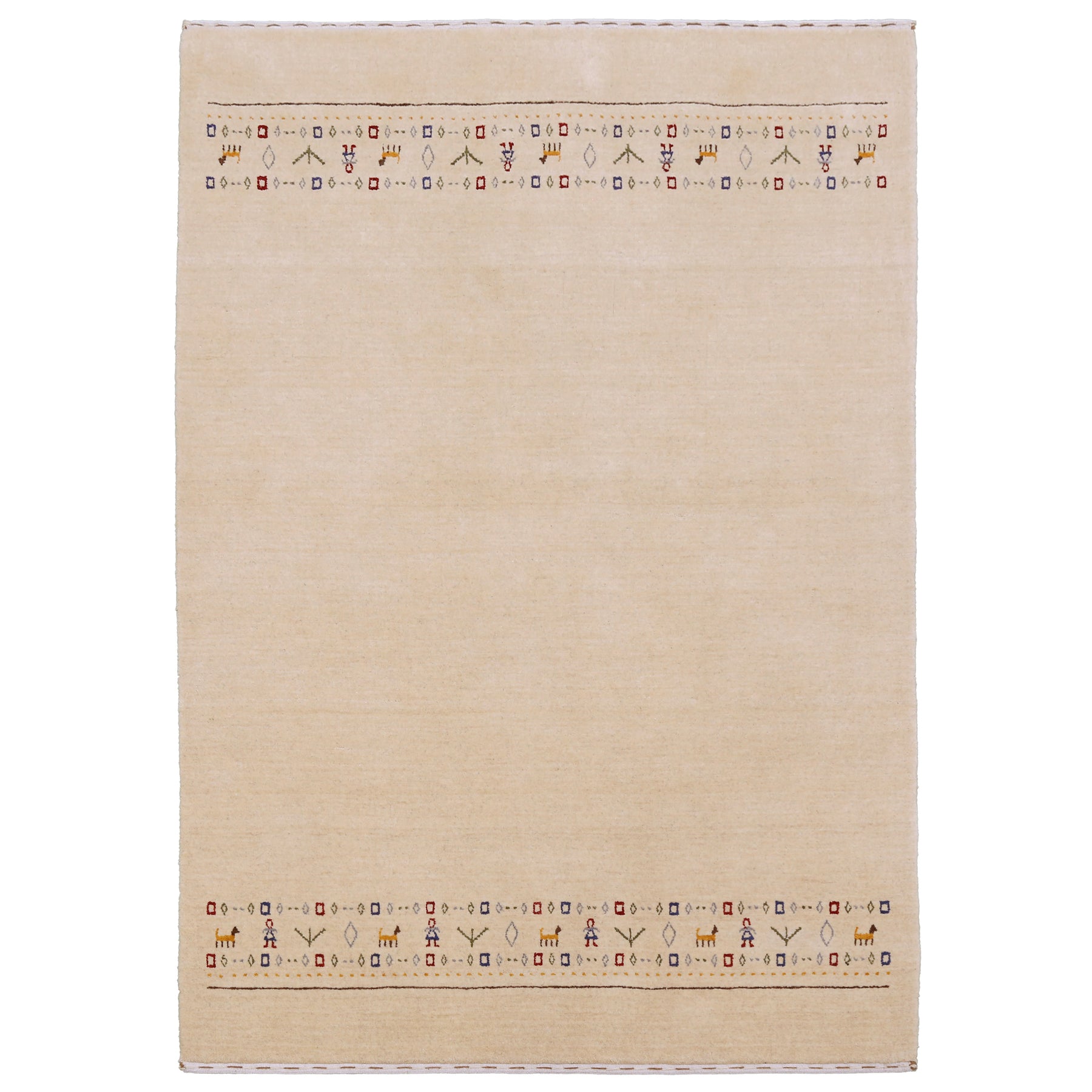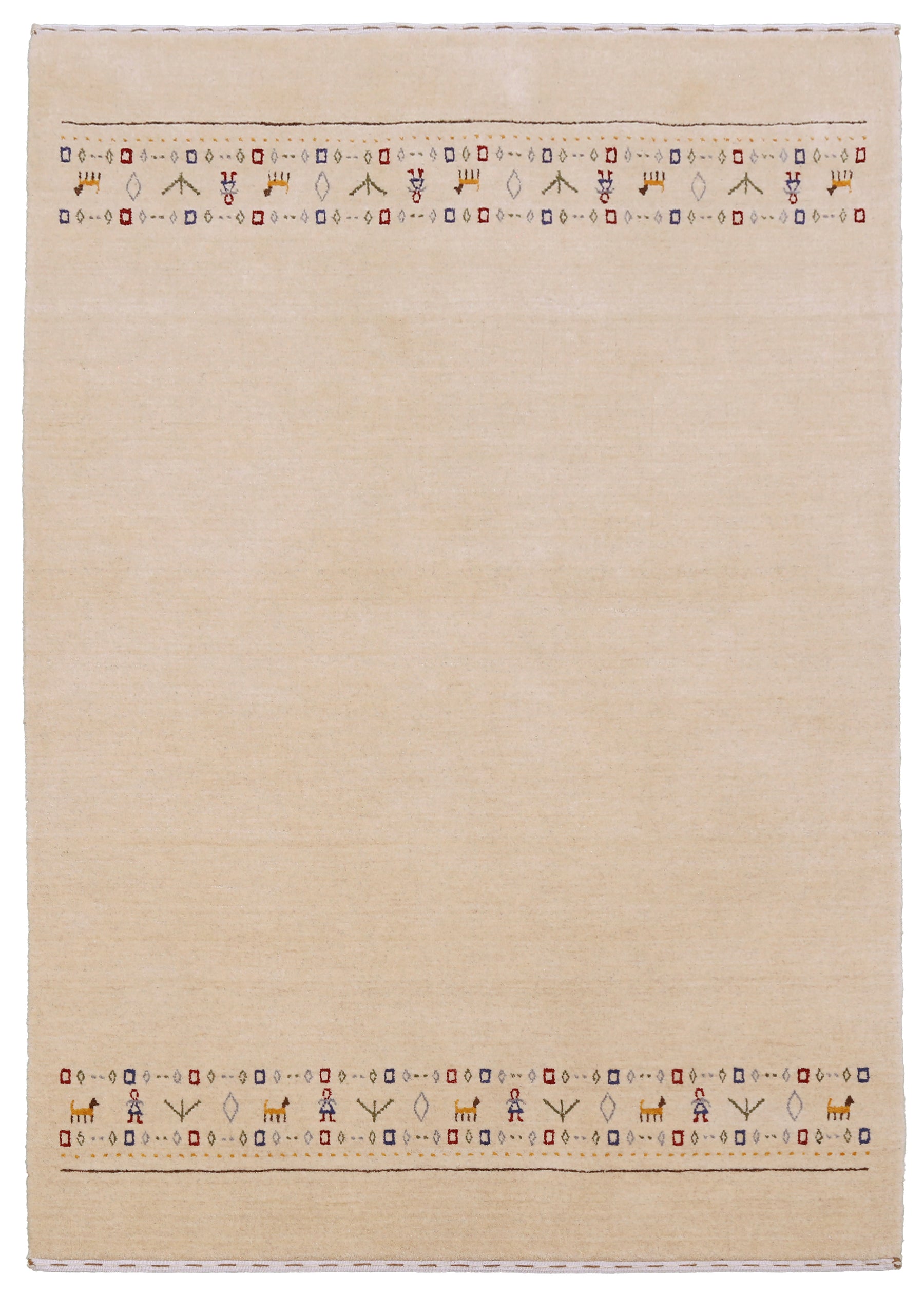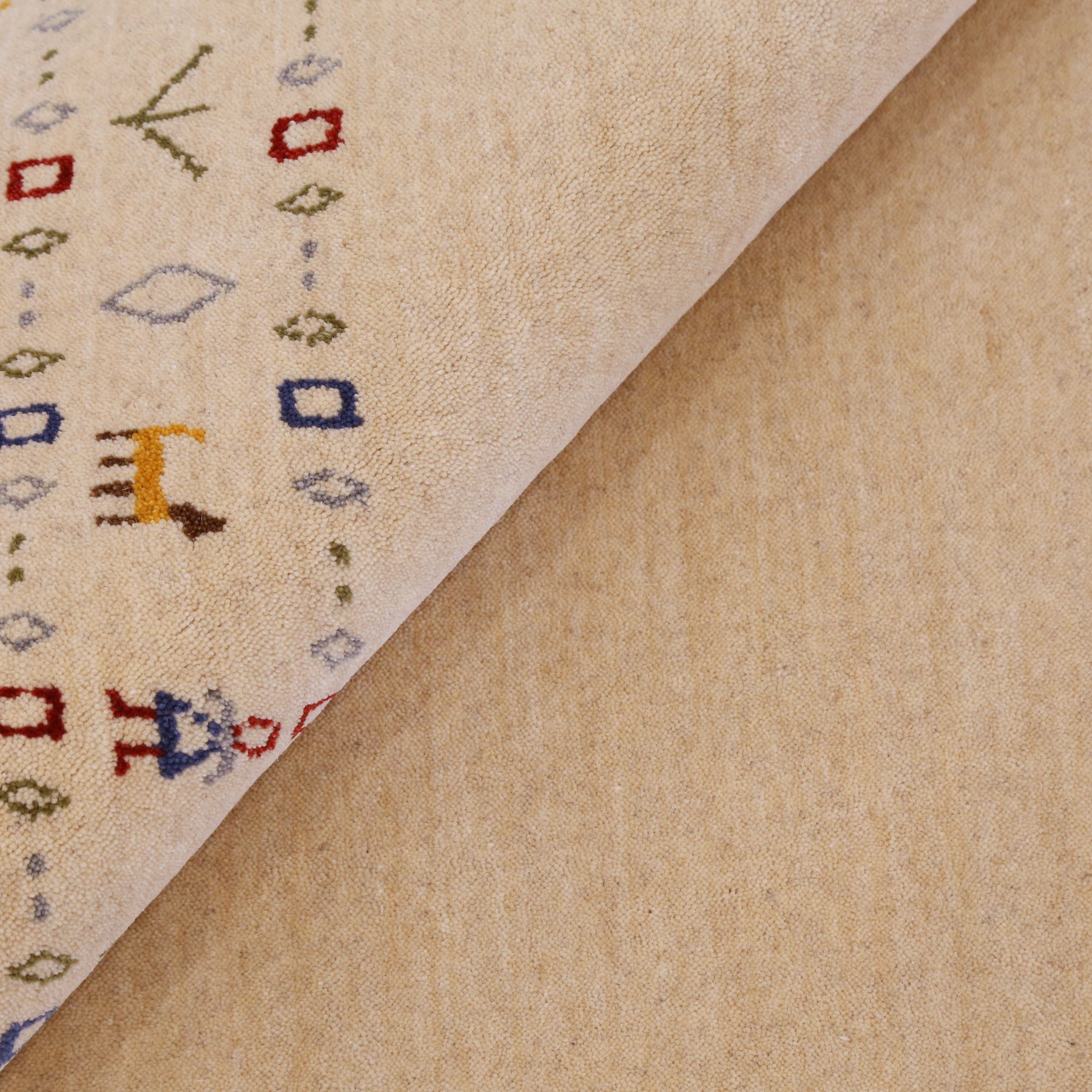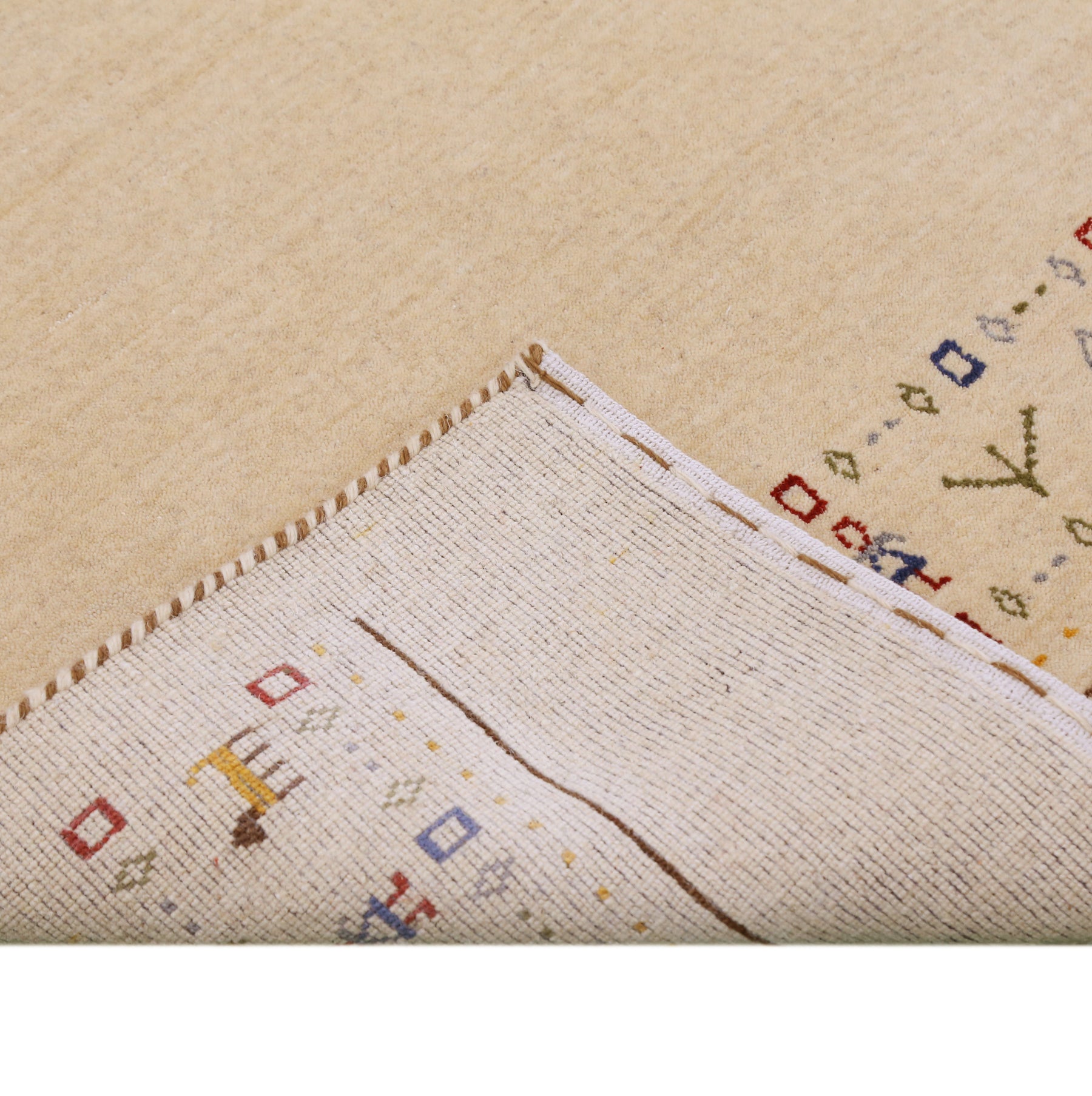 Woven by hand using premium wool, this area rug features distinctive tribal border designs in warm ivory hues. The traditional looming process ensures exceptional durability and authentic character. Its geometric patterns and natural fiber composition deliver both visual sophistication and practical longevity, making it a refined addition to discerning interiors.